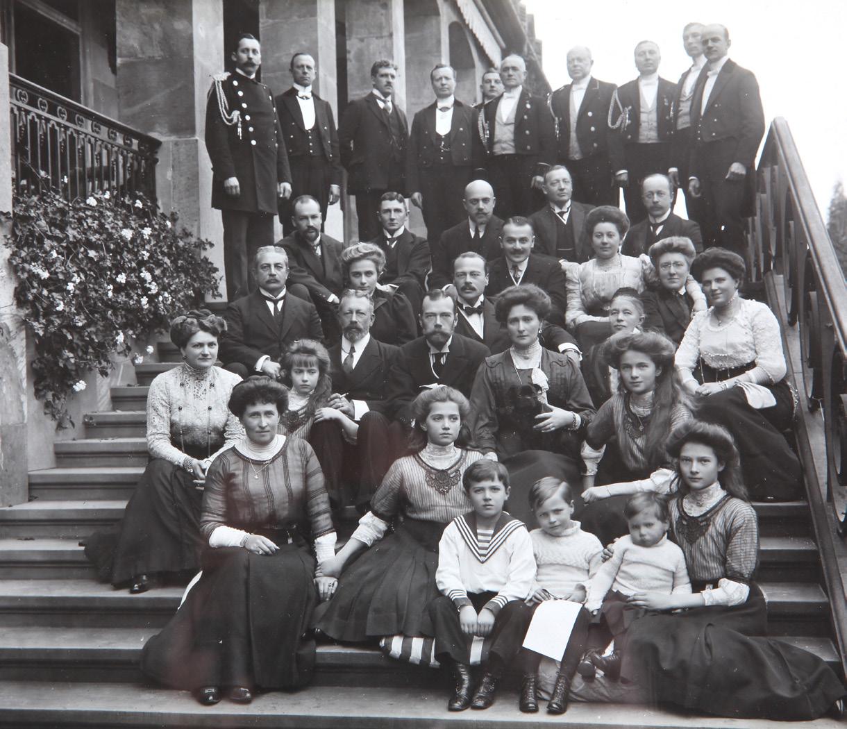 Abb. 12: Sommer 1910 auf der Freitreppe des Herrenbaus, erste Reihe (von links): Irene von Preußen, Zarentochter Maria, Zare witsch Alexej, die Brüder Don und Lu von Hessen, Cousine Tatiana; zweite Reihe: Großherzogin Eleonore, Zarentochter Anastasia, Heinrich von Preußen, Nikolaus II., Zarin Alexandra (mit Mops), Tochter Olga; dritte Reihe: Oberhofmeister von Riedesel, Hofdame von Bützow, Ernst Ludwig, Flügeladjutant von Massenbach, Hofdame von Rotsmann; ferner Angehö rige des Hofstaats und Dienerschaft (KHH)