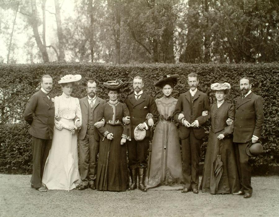Abb. 9: Schwäger und Geschwister vor der Gartenhecke in Wolfsgarten (von links): Ernst Ludwig, Alix und Nikolaus II., Irene und Heinrich von Preußen, Ella und Sergej von Russland, Victoria und Ludwig von Battenberg, 1903 (Grhzgl. Familienarchiv)