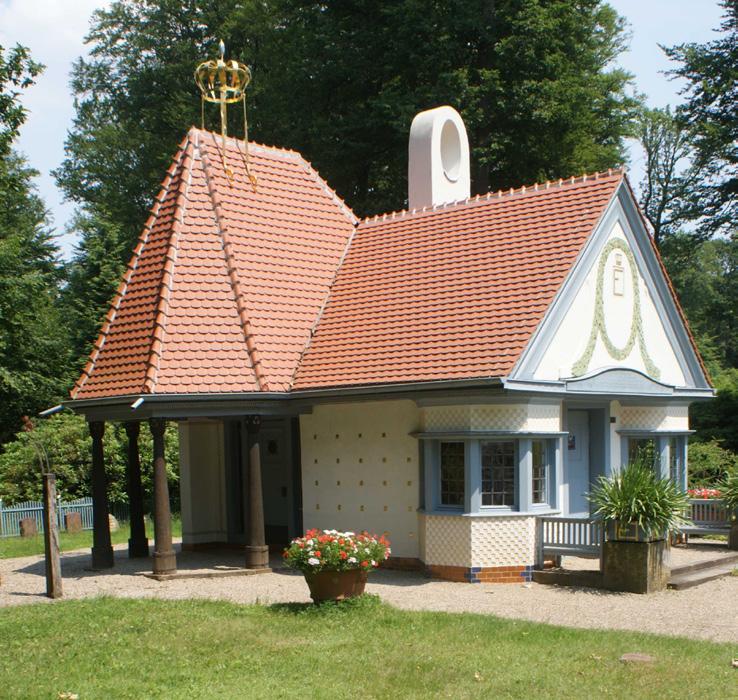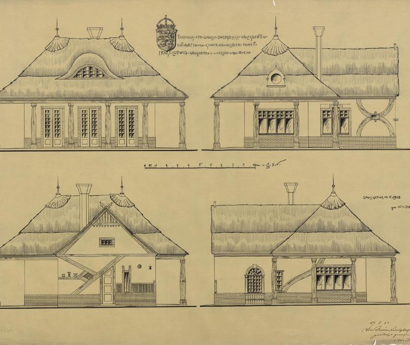 Vom leitenden Architekten der Mathildenhöhe, Jo seph Maria Olbrich, ließ Ernst Ludwig 1902 einen Traum seiner siebenjährigen Tochter Elisabeth verwirklichen. Sie war das einzige Kind aus der 1901 geschiedenen Ehe mit Ernst Ludwigs Cousi ne, Victoria Melita von Sachsen-Coburg, die von der Queen gestiftet worden war. Das Spielhaus im Wolfsgartener Park ist heute das einzige vollstän dig erhaltene Gesamtkunstwerk Olbrichs (Abb. 7).