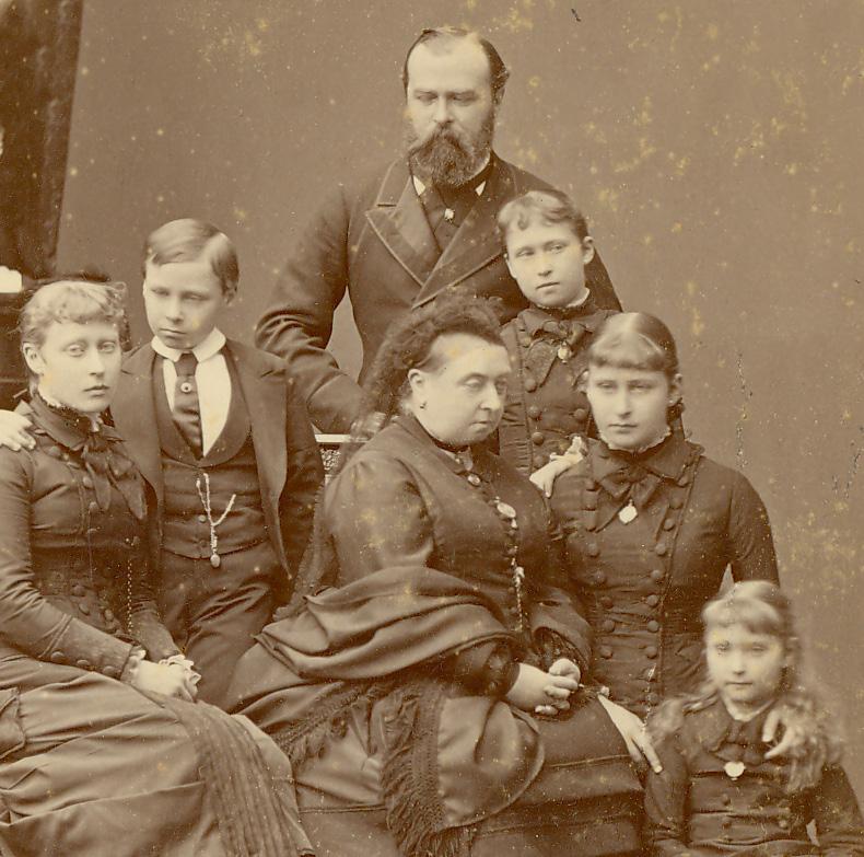 Abb. 3: Die trauernden Hinterbliebenen (1878): in der Mitte Königin Victoria, hinter ihr der Witwer Ludwig IV., links Victoria, Ernst Ludwig (Ernie), Irene, Elisabeth (Ella) und Alix (HStAD)