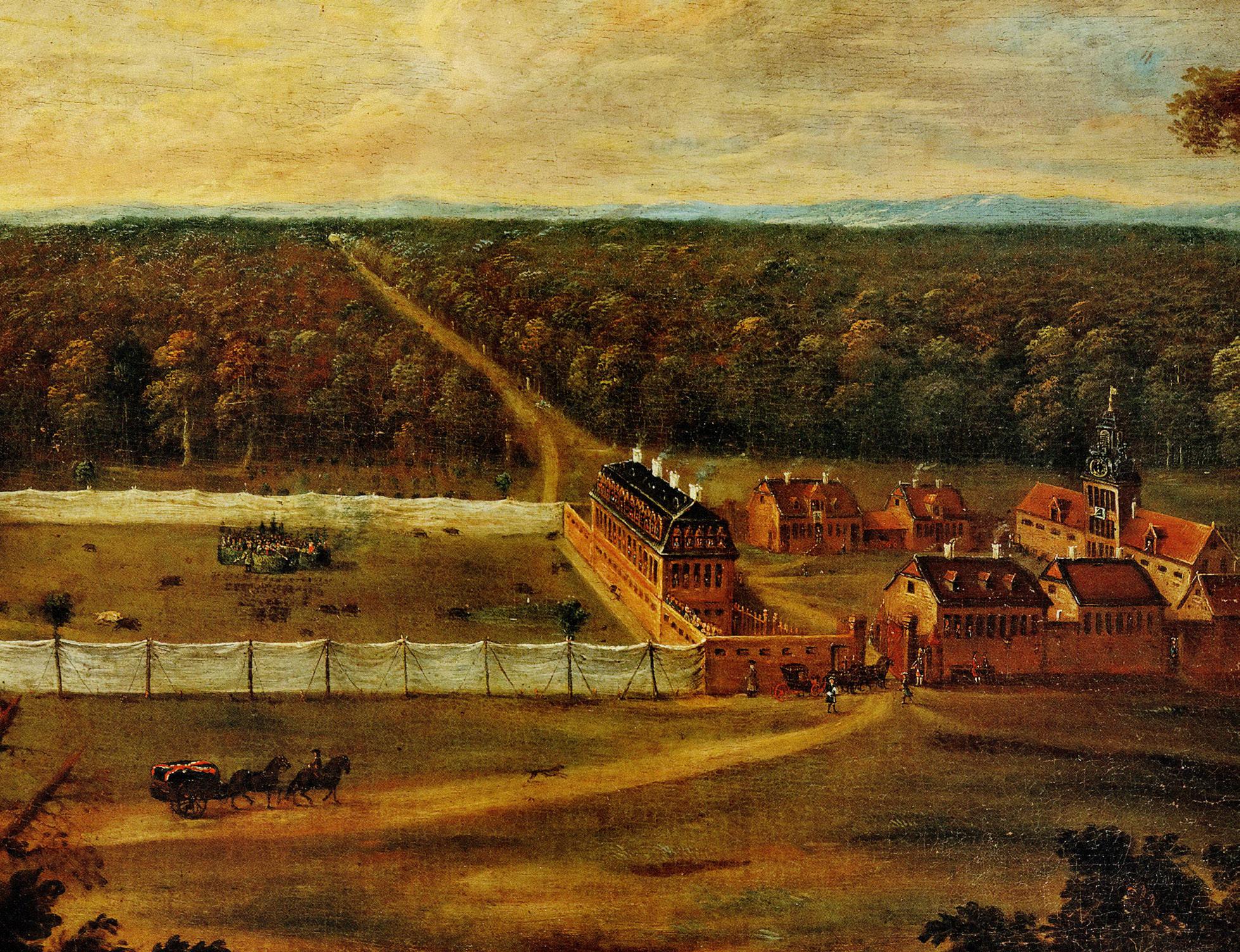 Links im Bild (Abb. 1) ist gerade eine sogenannte ‚eingestellte Jagd‘ im Gange. Das Wild wurde in ein von „Jagdlappen“ eingezäuntes Gehege getrieben und von den fürstlichen Jägern von einem erhöhten Jagdstand aus abgeschossen. Aus sicherer Entfernung des Herrenbaus ergötzt sich die Hofgesellschaft an dem Spektakel.