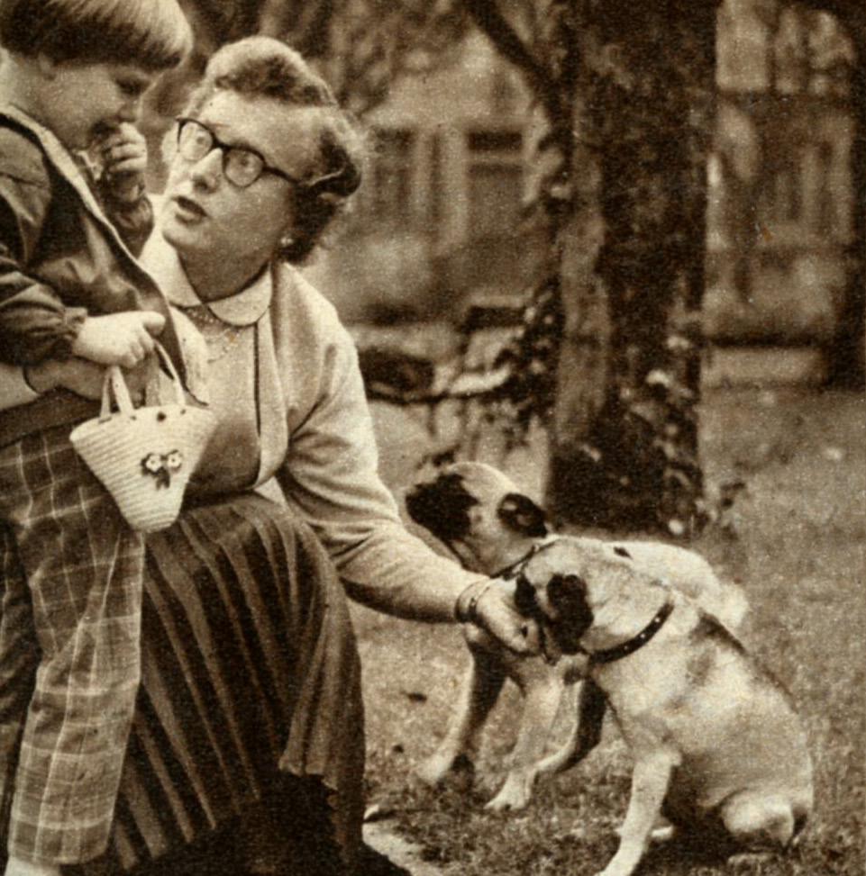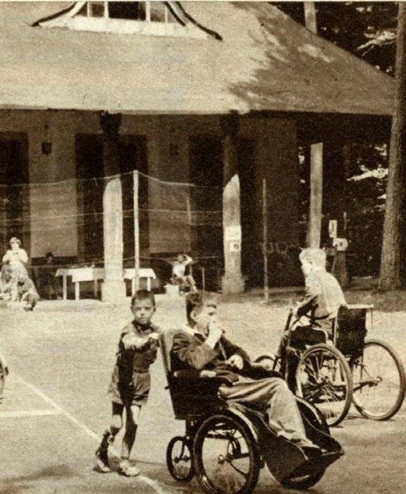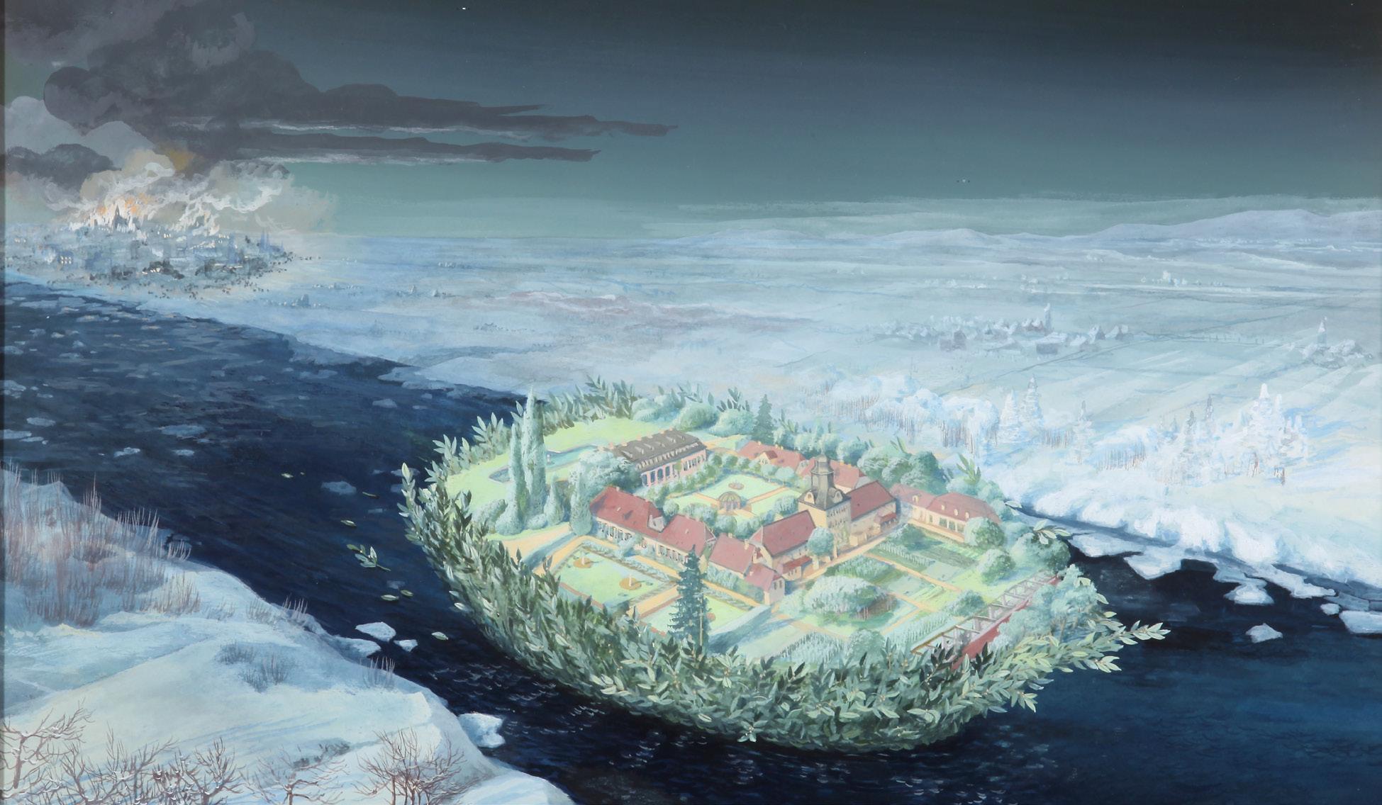 Abb. 17: Wolfsgarten als blühende Insel in einer von Feuer und Kälte bedrohten Welt, Gouache von Enrico d'Assia (Heinrich Prinz von Hessen), 1958 (KHH) Abb. 19, 19a: Margaret und Kinder mit Behinderung vor dem Teehaus, Zeitungsfoto 1956 (AHH)An sie erinnern heute die Darmstädter Kinderklini ken Prinzessin Margaret und die PrinzessinMargaret-Allee, an der Wolfsgarten liegt.