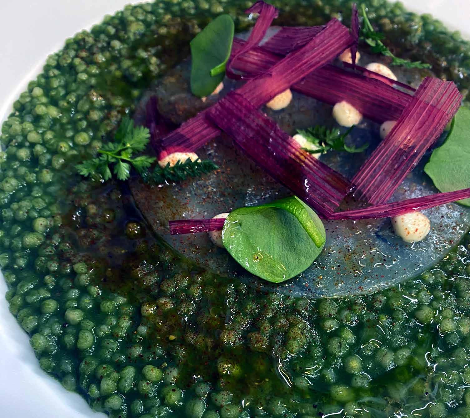 PERLGRAUPEN MIT KRÄUTERN, GARNELEN-CARPACCIO UND KANDIERTEM RHABARBER