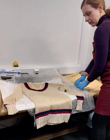 Rebecca Grafton, demonstrating the safest way to fold and store pieces of uniform, in acid-free tissue paper.