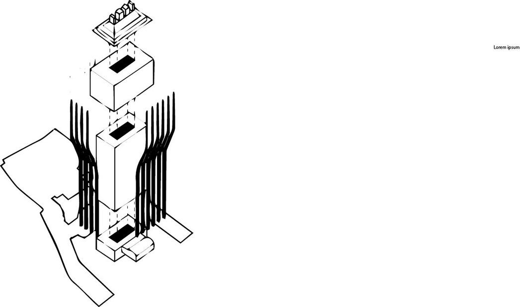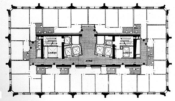 da estrutura portante que se conectam às vigas oblíquas que surgem do décimo quinto andar;