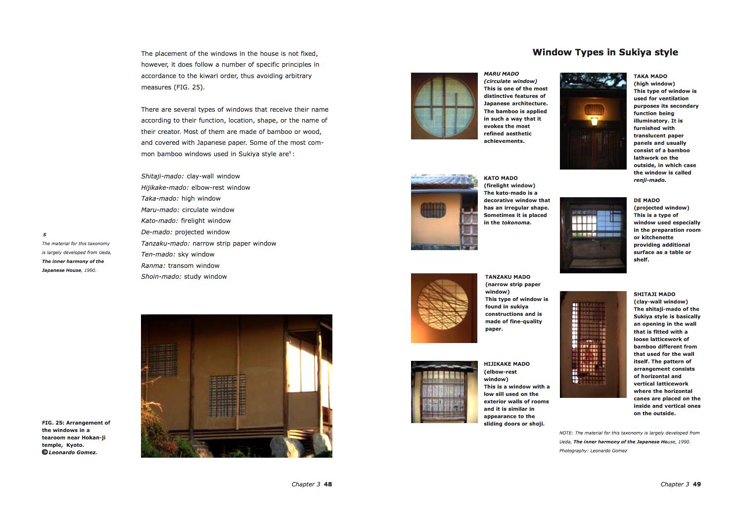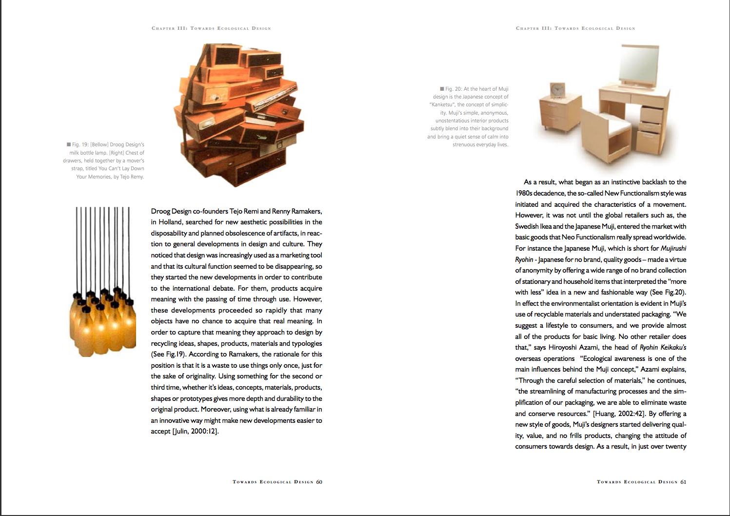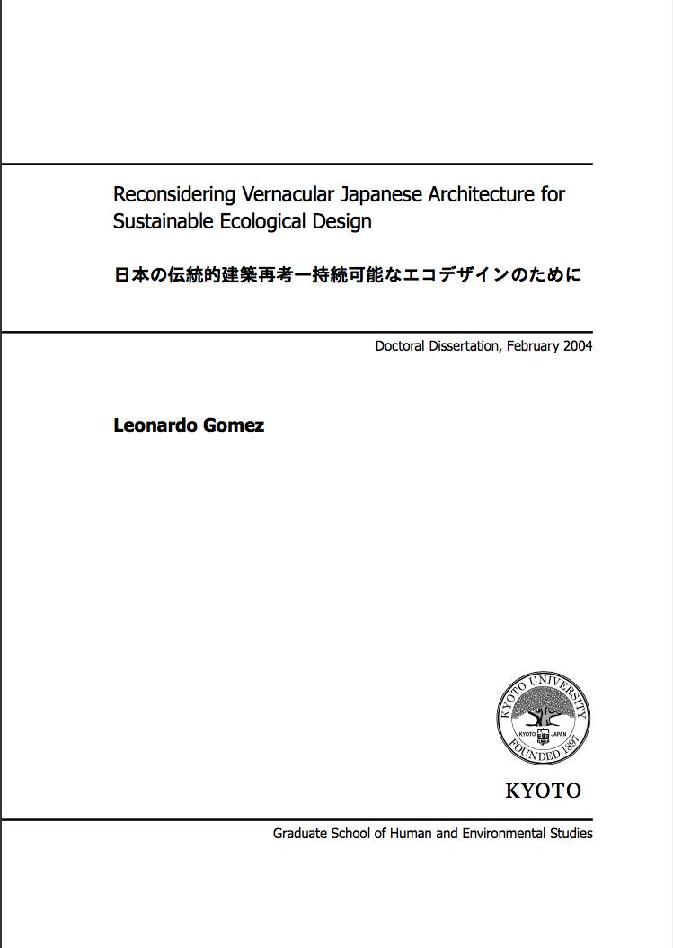 O estudo começa discutindo as questões que deram origem ao conceito de desenvolvimento sustentável, explicando como a Agenda 21 proporcionou um quadro abrangente para a implementação da sustentabilidade na indústria da construção civil, e como a eco-eficiência tornou-se o principal princípio norteador na formulação do design daquela época. Porém, utilizando exemplos práticos da arquitetura e do design industrial, a pesquisa demonstra que o interesse das empresas pela adoção de práticas eco-eficientes, foi, e continua sendo, uma escolha errada que, apesar de Gómez Leonardo, Reconsidering Vernacular Japanese Architecture for Sustainable Ecological Design Tese de doutorado Kyoto, 2004.
