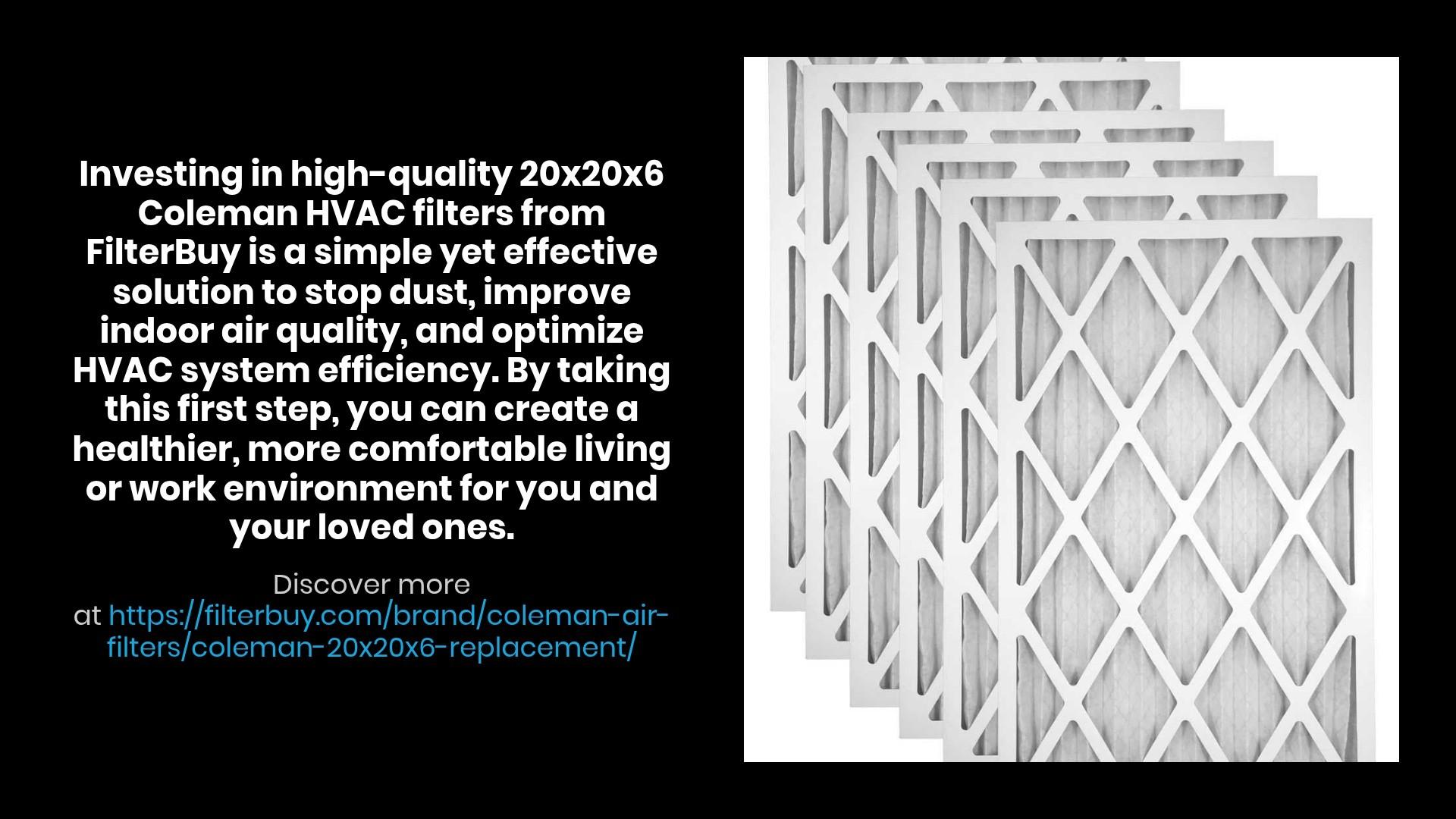 The 20x20x6 Coleman HVAC furnace replacement air filter is built with an extra-deep 6-inch design that delivers exceptional filtration capacity. Its large surface area allows it to trap more dust, pollen, lint, and pollutants while maintaining excellent airflow. This prevents strain on your HVAC system and extends the time between filter changes. Homes dealing with heavy dust, shedding pets, or air quality concerns benefit from its superior performance. Tap here to learn how the 20x20x6 Coleman filter supports long-lasting airflow and indoor comfort.