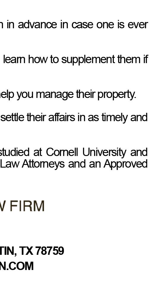 RECOMMENDED SERVICE DIRECTORY AIR CONDITIONING CONTRACTOR Chilly Air Services........................................................................................................................17 ARBITRATION Dickenson Murphy Rex & Sloan................................................................................................21 ARCHITECTS AHS Design Group......................................................................................................................19 AUDIOLOGIST Hears to You................................................................................................................................24 CUSTOM HOME BUILDER Sitterle Homes.................................................................................................................. Back Cover Casadomaine.......................................................................................................... Front Inside Cover ELDER LAW The Garrett Law Firm.....................................................................................................................5 EMPLOYMENT AGENCY The Personnel Store Inc.............................................................................................................35 FAMILY LAW Law Offices of J. Randall Grimes ..................................................................................................9 FINANCIAL ADVISOR Rosalynd Shaw - Northwestern Mutual...................................................................................25 HEARING AIDS Hears to You................................................................................................................................24 INTERNATIONAL REAL ESTATE Dana Leslie - Kuper Sotheby’s International realty....................................................................1 LAND & LUXURY SPECIALIST Lesli Ray - Coldwell Banker Realty........................................................................ Back Inside Cover LITIGATION/ TRIAL ADVOCACY Dickenson Murphy Rex & Sloan................................................................................................21 MARINE SUPPLY STORE Lake LBJ Dock Service....................................................................................................................9 MEDIATION Dickenson Murphy Rex & Sloan................................................................................................21 MORTGAGES Independent Mortgage.................................................................................................................3 PROBATE ATTORNEY The Garrett Law Firm.....................................................................................................................5 REAL ESTATE Thrive Realty...................................................................................................................................7 Chandni Mahendru - Coldwell Banker Realty..........................................................................39 RESTAURANT Teriyaki Madness........................................................................................................................39 SCHOOL OF REAL ESTATE Champions School of Real Estate........................................................................................22-23 WINERY Adega Vinho Winery..............................................................................................................10-11 40