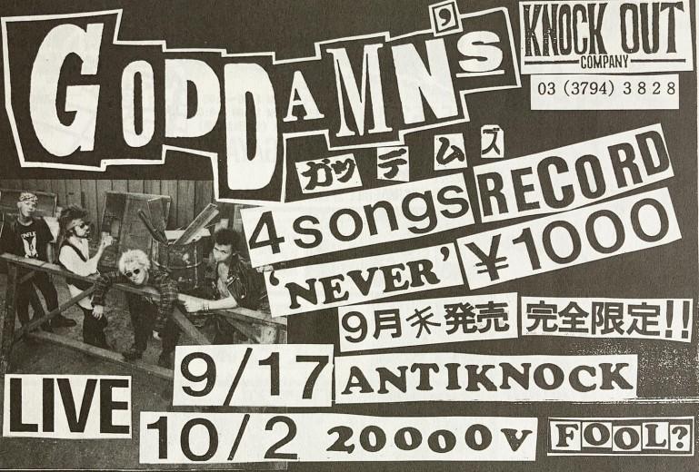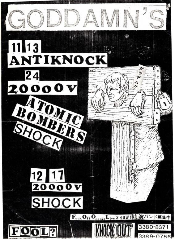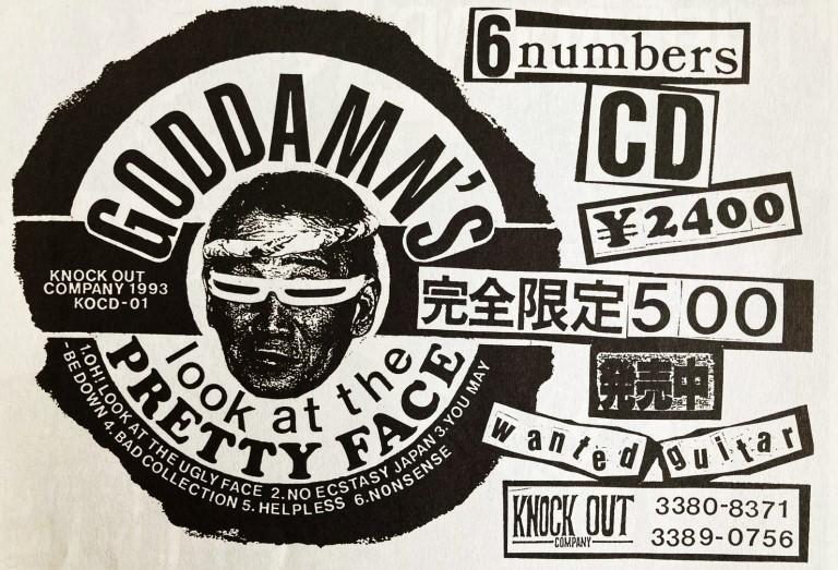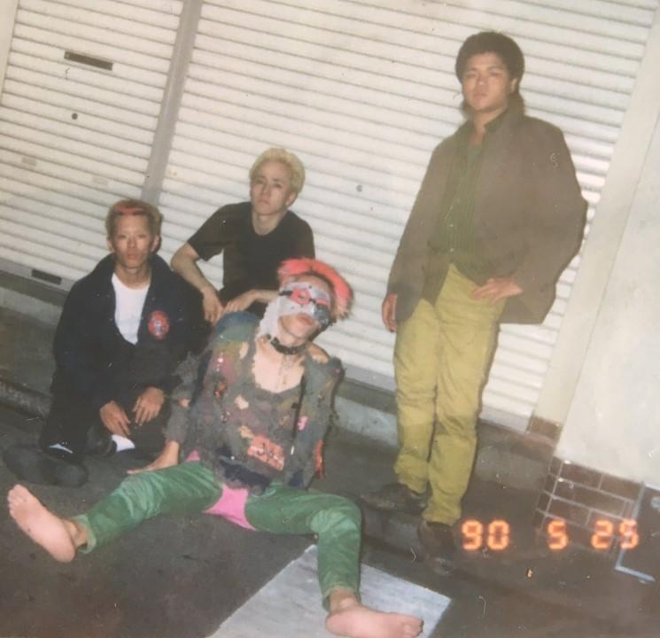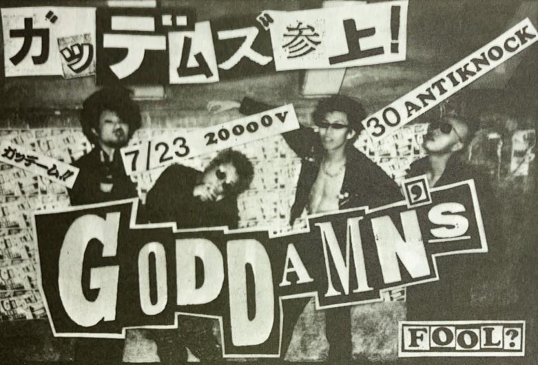 In 1990 Visha (Guitar, 24), Me - Inkichi (Bass, 20) and Carrot (Vocals, 19) from the band Rude Cats recruited Crow (Drums, 19) to join the band. It was decided that the name would be changed to Goddamn’s and we started playing ‘Shokipan’ (70’s style punk). The four of us were sat in the square outside of Seibu Shinjuku station until the early morning thinking of a band name.