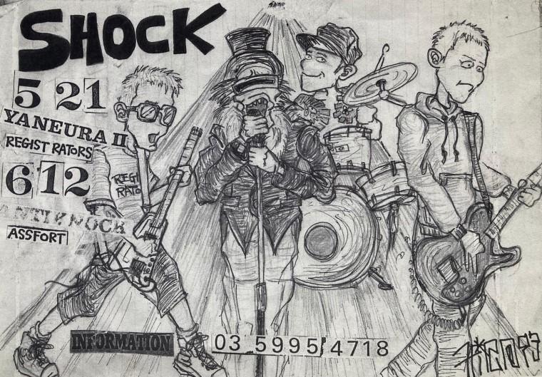 In 2010 I saw Tokyo punk band The Slowmotions at Moonstep in Nakano, I enjoyed their records but their live performance was great, particularly the singer who was climbing the speakers and wearing a pair of sunglasses shaped like cakes that said ‘Happy Birthday’ on them. The next time I saw them they had a different singer and it just wasn’t the same. Around this time I bought a flexi disc by a band called Shock on the basis of the artwork and the fact one of the members was wearing his underpants over his jeans from Record Shop BOY in Tokyo and the owner Satoru told me that he thought there was some connection to The Slowmotions. It took me a while to piece two and two together and make the connection that Isami the vocalist of Shock was the vocalist of Slowmotions when I first saw them. My friend Pooly later sent me the Shock/ Registrators split CD and I totally loved it, it was miles better than the flexi. On this CD Shock play quite angular and jarring sounding punk rock that reminded me of the early Japanese bands such as Friction and Mirrors mixed with 70’s UK punk along the lines of the X-Ray Spex (who they cover on their demo tape) and Buzzcocks. Isami (aka 133) was more than happy to share stories of his old band Shock in this exclusive interview.
