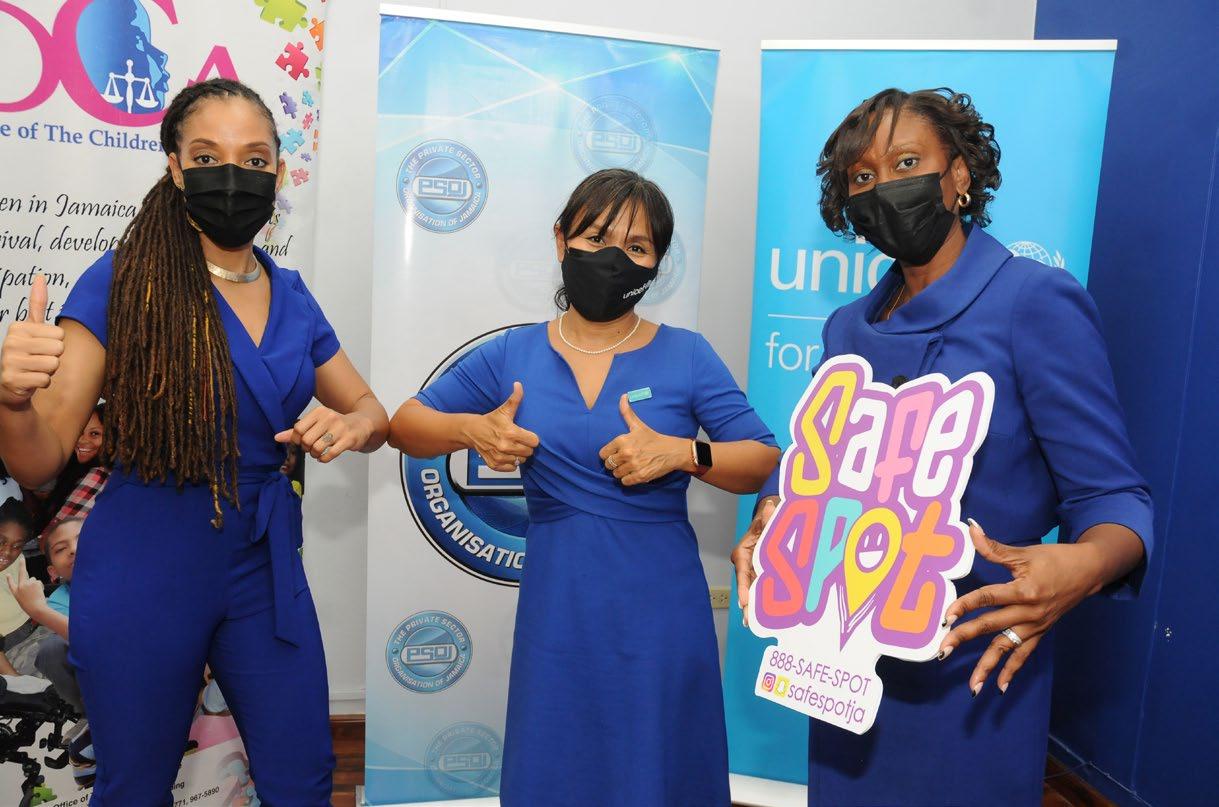 PSOJ Executive Director Imega Breese McNab joins Country Representative of UNICEF Jamaica, Mariko Kagoshima and Children’s Advocate Diahann Gordon-Harrison for the launch of the 24/7 Teen & Child HelpLine SafeSpot.