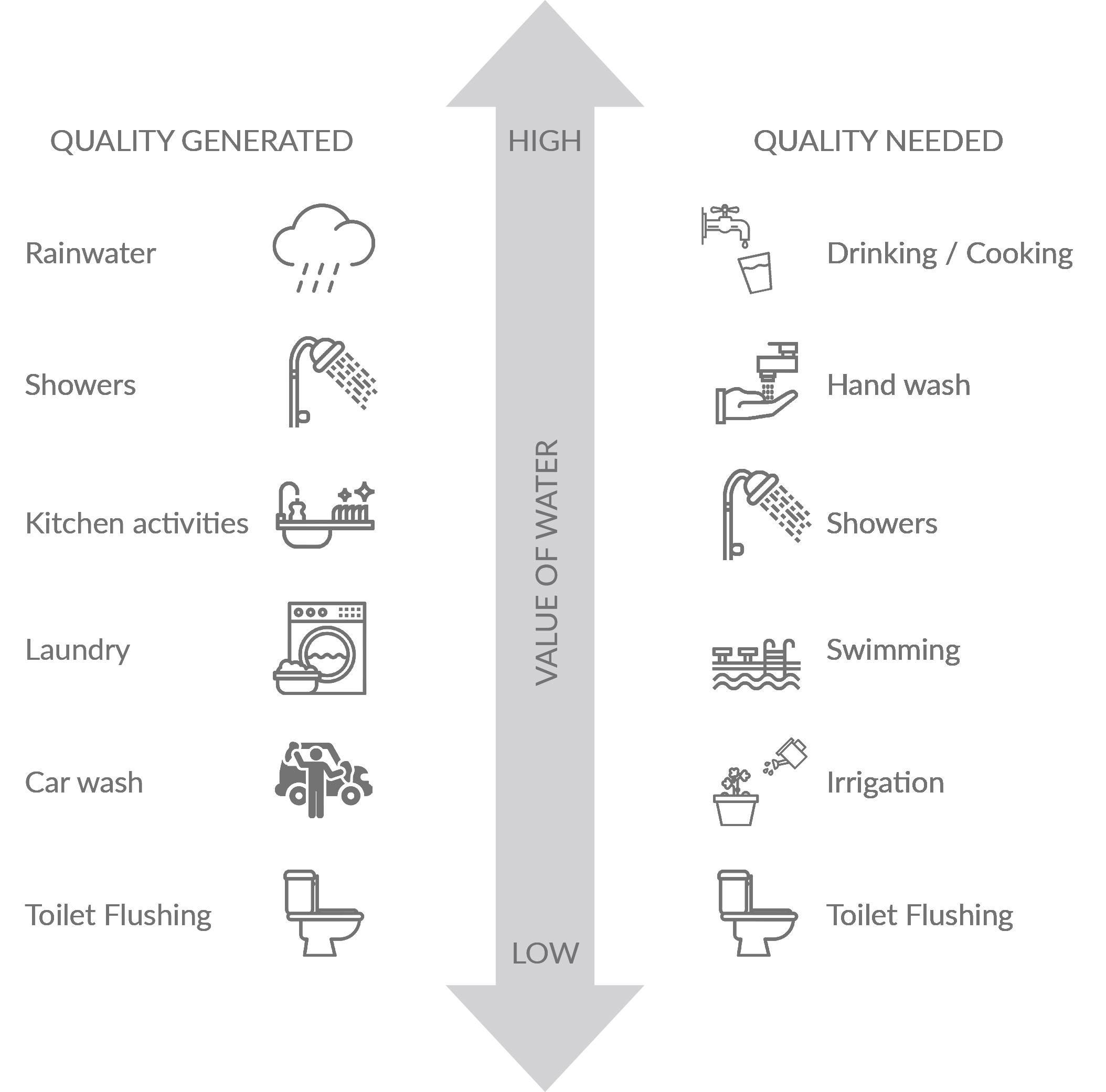 and mitigation of extreme withdrawal of resources was extensively explored. Urban water management involves massive investment for the procurement, treatment, storage, collection, re-treatment and discharge of water. Due to the singular supply point and treatment point these facilities fall short in addressing the non-binary water demand. The latent belief is that water quality is binary, either perfectly clean, or entirely dirty. A range of water qualities are required to fulfill the water demand however water once used is considered a waste and is referred to as sewage or waste water, its potential treatment and re-use is not widely considered.