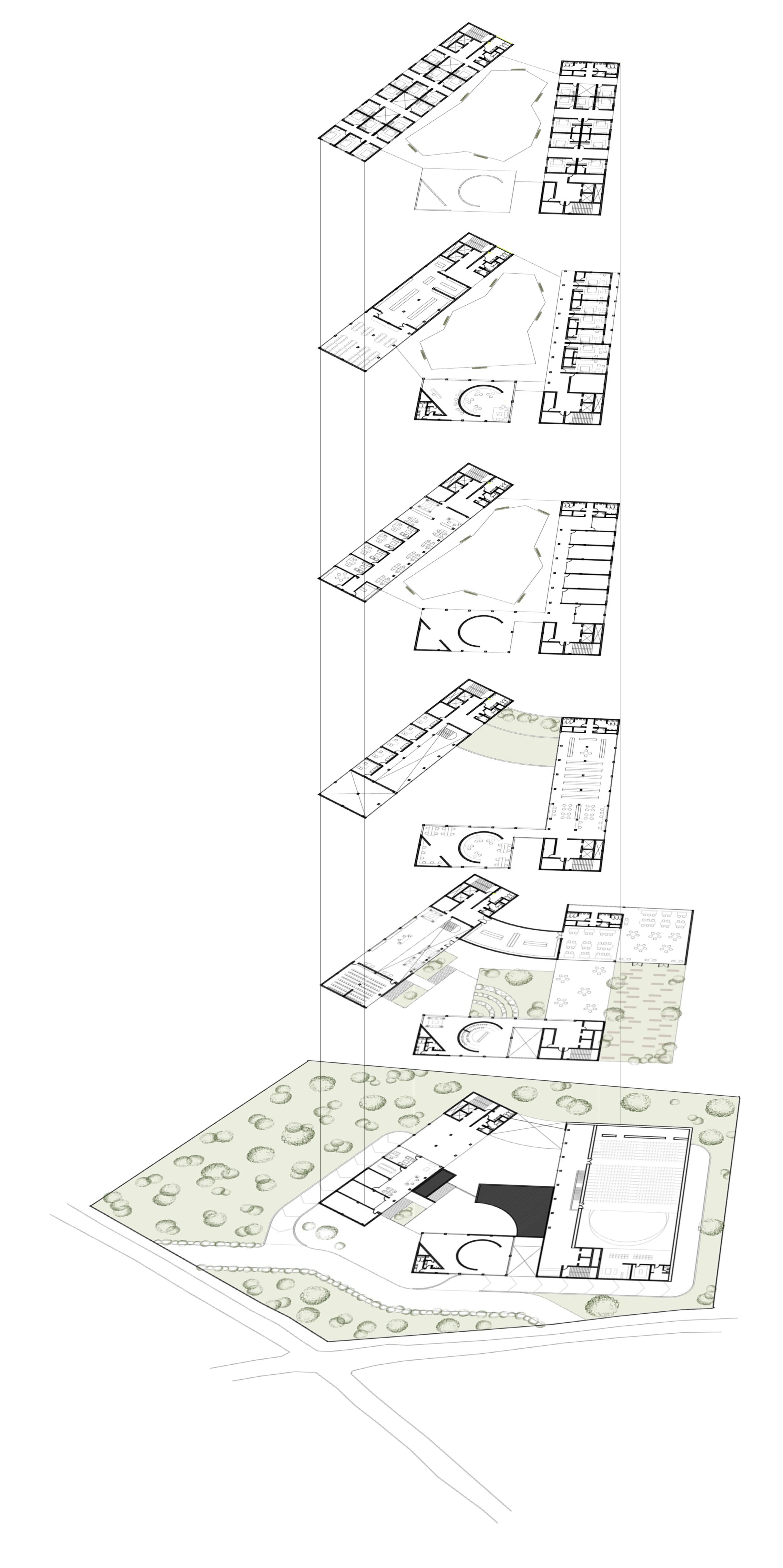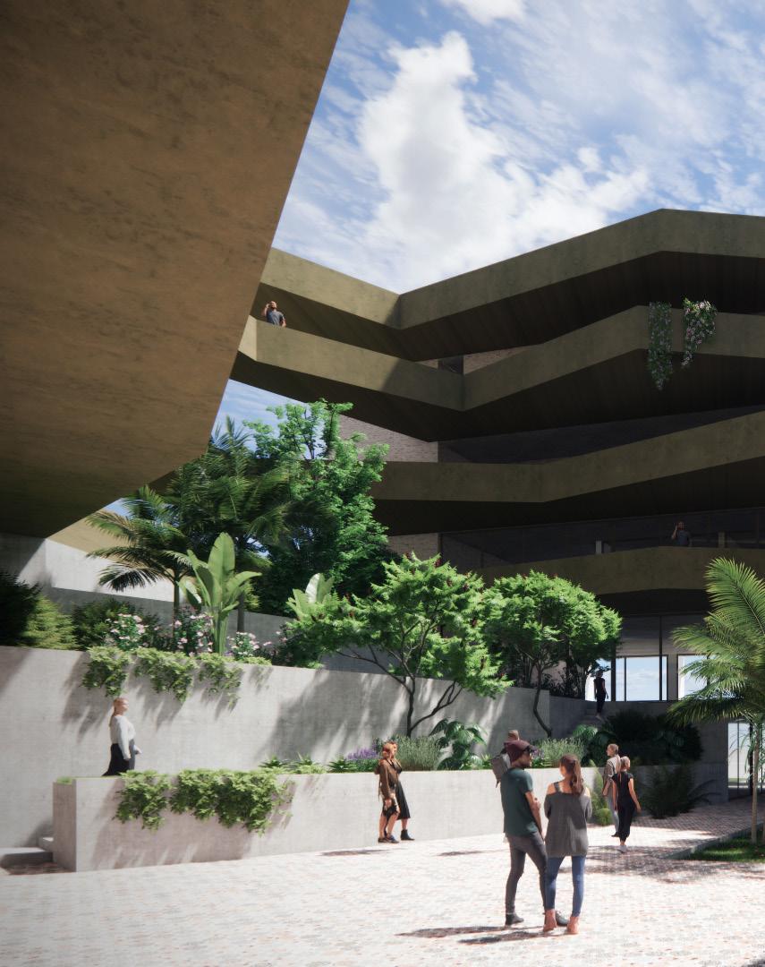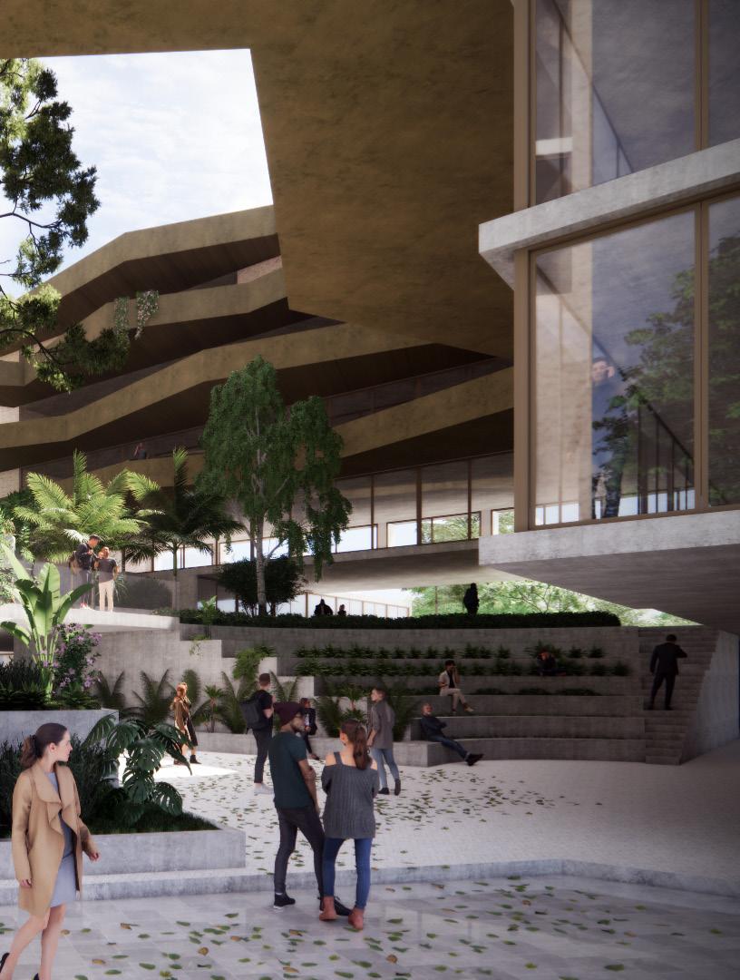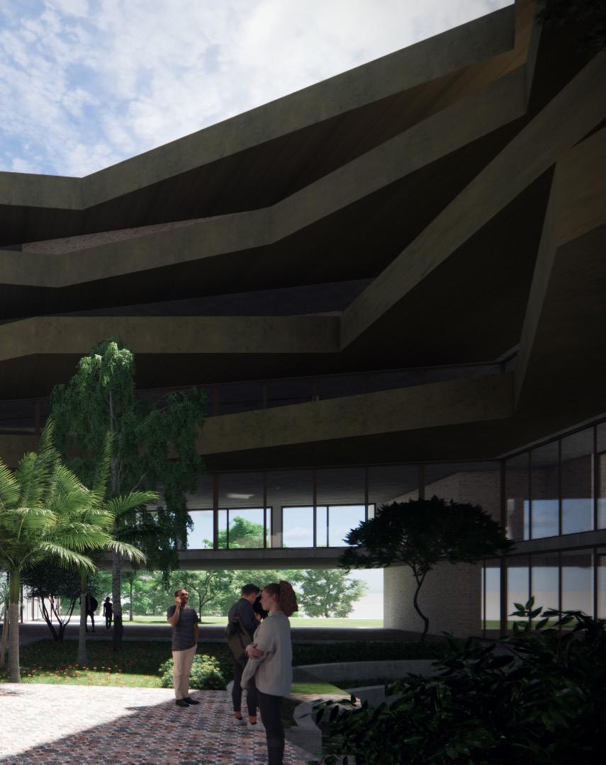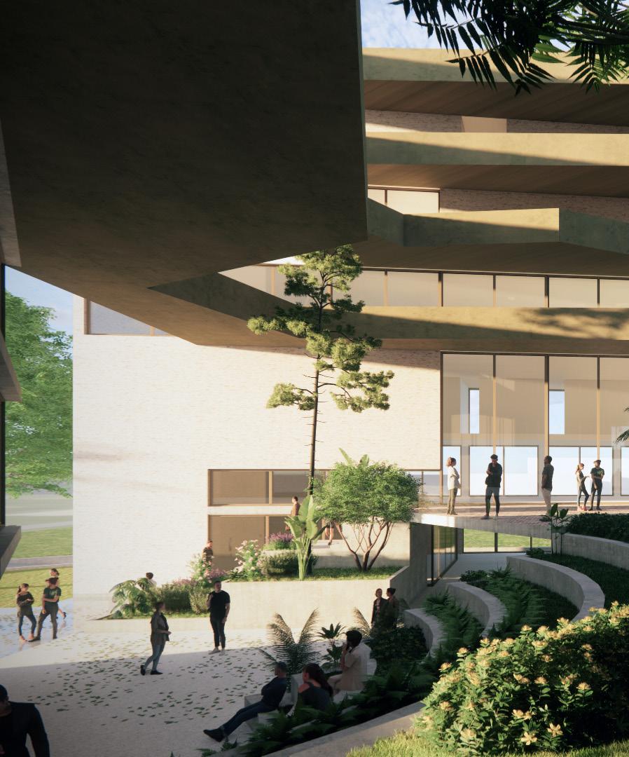 With this idea, Sifti Design studio approached the design competition of Excellence Centre for Council of Architecture, To be built on the lush green campus of Bangalore University. An attempt has been made to find an architectural language that would address the intense urban context of the city. Housing diverse functions such as an auditorium, labs, exhibition hall, Restaurant, Administration, and accommodation, The design is characterized by flexibility of design, allowing the building to adapt to future changes in learning needs and requirements. A central courtyard connects the functions creating an engaging environment for chance encounters and conversations amongst variegated users of this building. In order to create interest at the human scale, this courtyard has been further split into two levels which aid in creating variety and fascination at the entrance point. Through greening of the building at all levels, the design encourages bringing the experience of plants from a binocular scale to personal close proximity for the users.