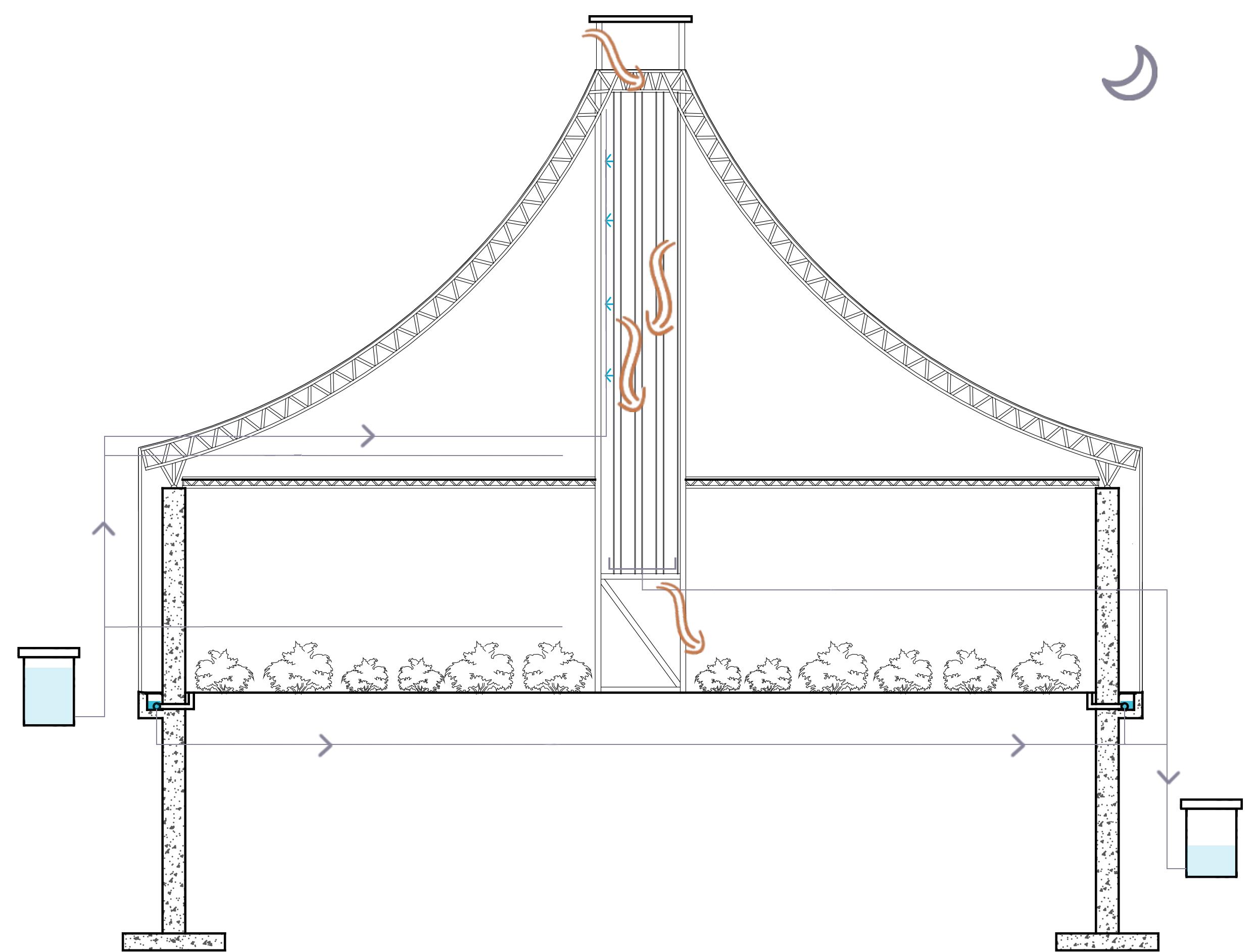 DETAIL A SHOWING THE DESIGN OF ROOF TO COLLECT MAXIMUM AMOUNT OF RAINWATER TO FALL ON IT BY INCREASED SURFACE AREA.