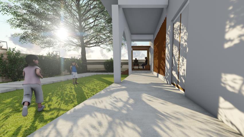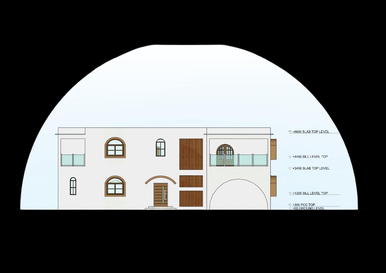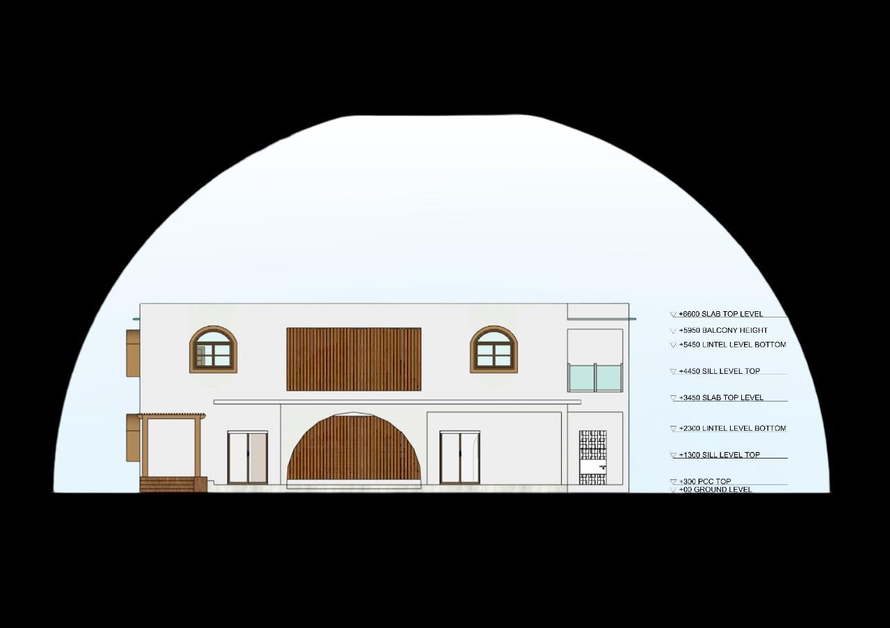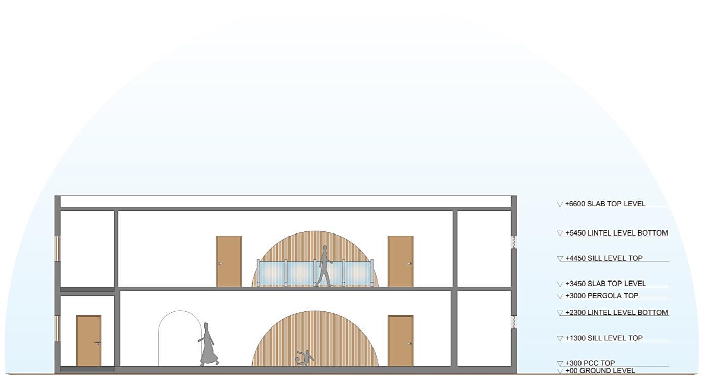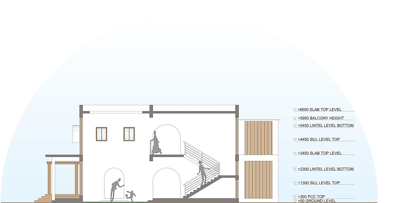 As seen throughout, specific elements have been designed with earthy tones, like, the jail, arched chajjas & windows, the outdoor pergola and the compound wall. It was done so to highlight those elements as they are main the connect between in & out