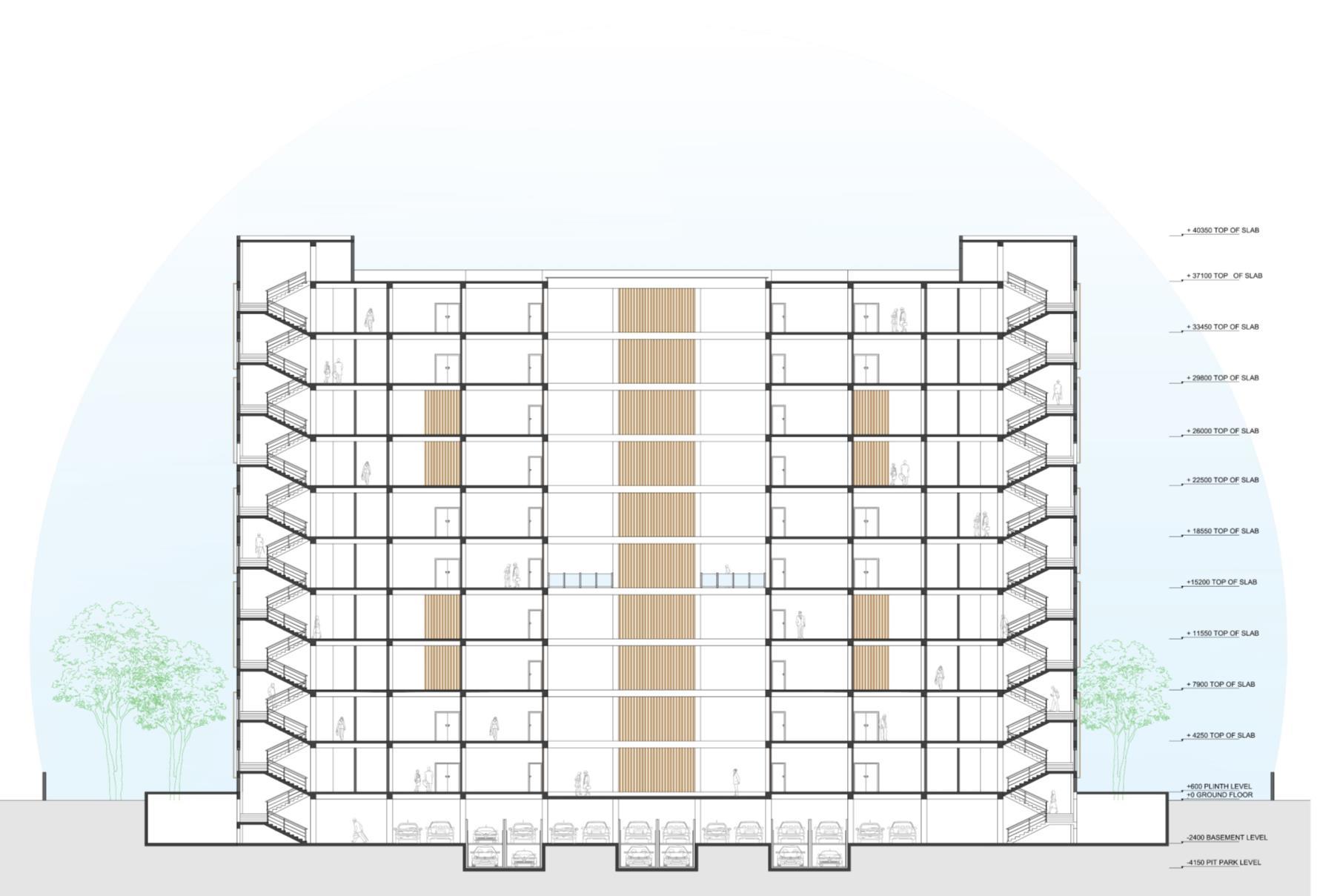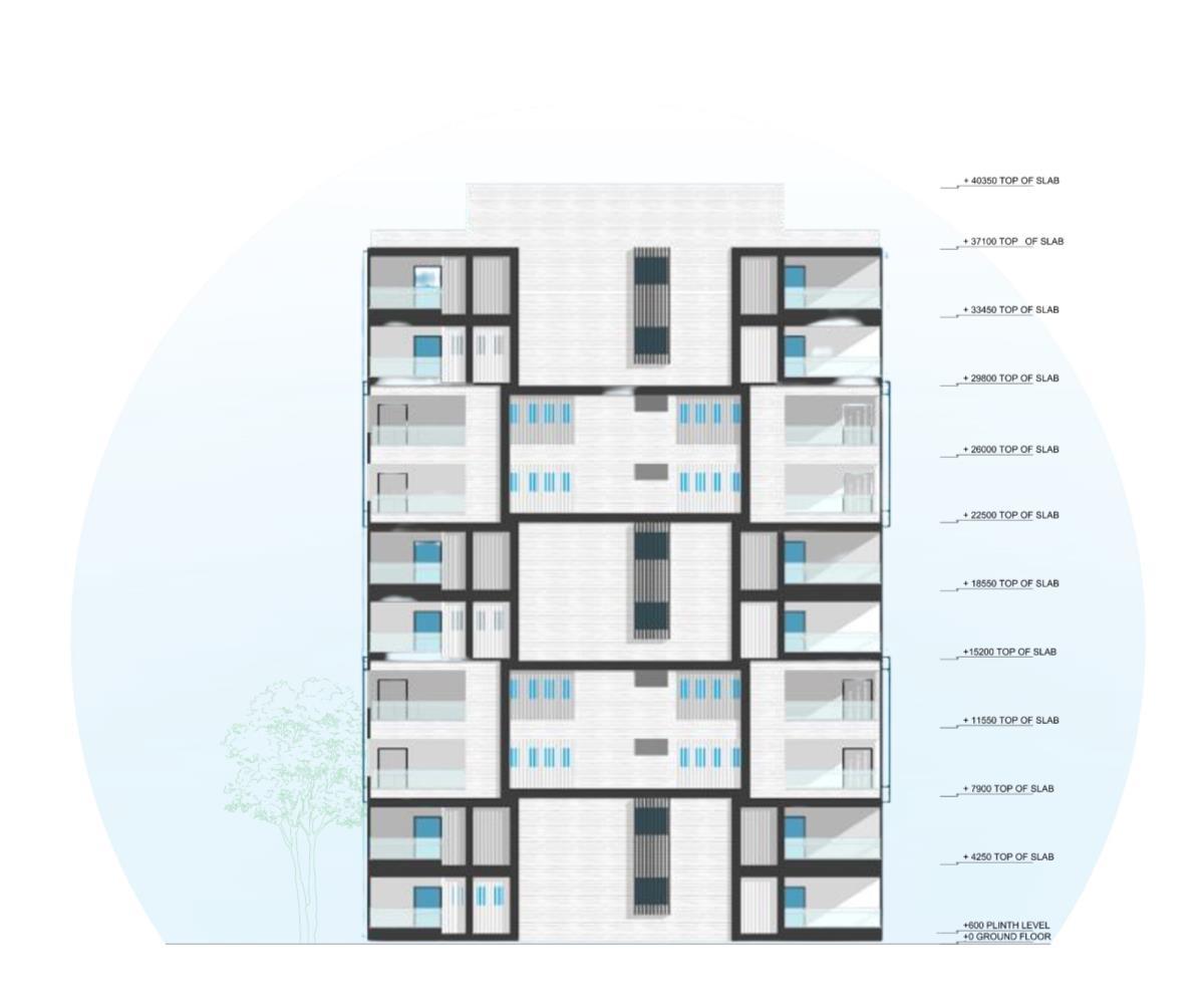 inspired from the The plans are simplistic with voids after equal change after ever courtyard at the center, and light are G+9 structure. core is placed at the building as it for utmost ease convenience of movement. façade design, its and practical jail over alternate