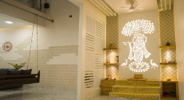 Living room continues the color scheme of drawing room with a touch of brown giving it a little warmth which also covers the beautiful mandir area.