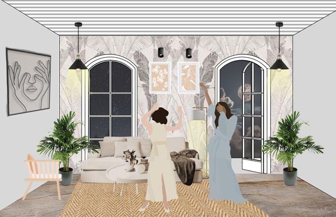 B) Concept Development : A bohomeian style of peach color with a touch of cane , abstract mirror , custom made designs.