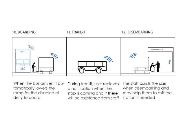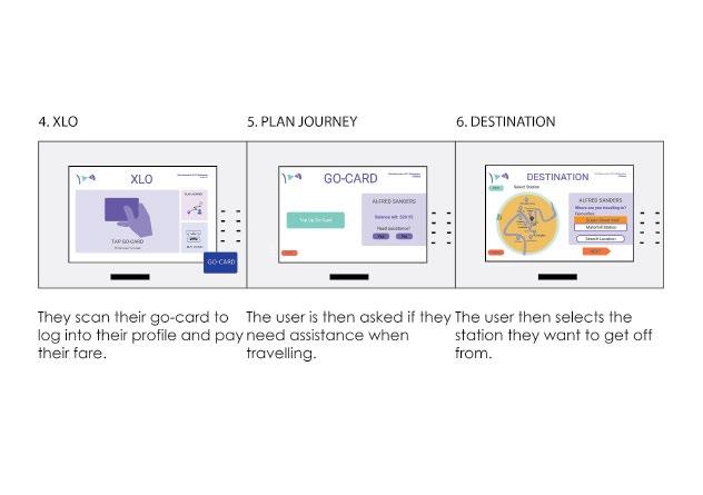 Projected to be used by 2030, XLO is an interactive screen embedded into smart bus stops and located at the entry of large bus stations. Users can scan their go-card to pay their fare, access travel updates, update their profile, plan a journey, top up Go-card, have assistance with navigation and improve the communication between the passenger and transport service. XLO aims to help the disabled elderly to allow them to notify the driverless bus and transport staff that they need assistance embarking and disembarking the vehicle and what type of assistance, during their journey at certain locations. The need for XLO is that it helps users, especially who need special requirements to plan and receive adequate assistance for their travel journey. When planning ahead, the users notify the driverless bus if they need any assistance, such as wheelchair ramps access to receive physical assistance if necessary.