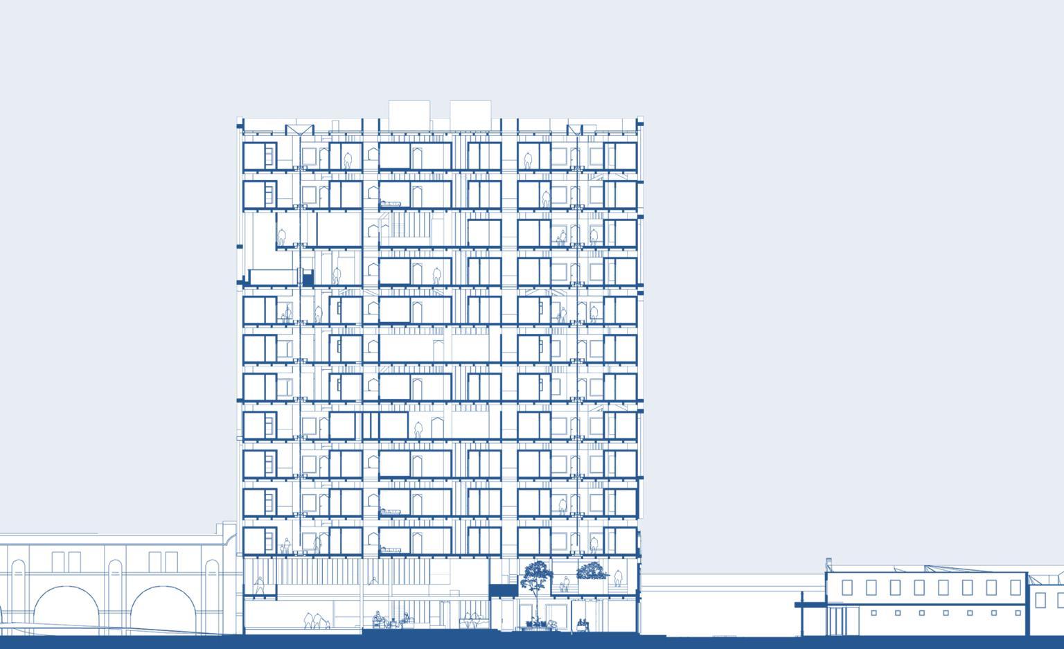 The section shows how the unit layout has been adjusted to create cutouts throughout the building, allowing better ventilation and natural sunlight to reach different areas. These cutouts enhance airflow and bring more light into both shared spaces and individual units, resulting in a healthier and brighter living environment for students
