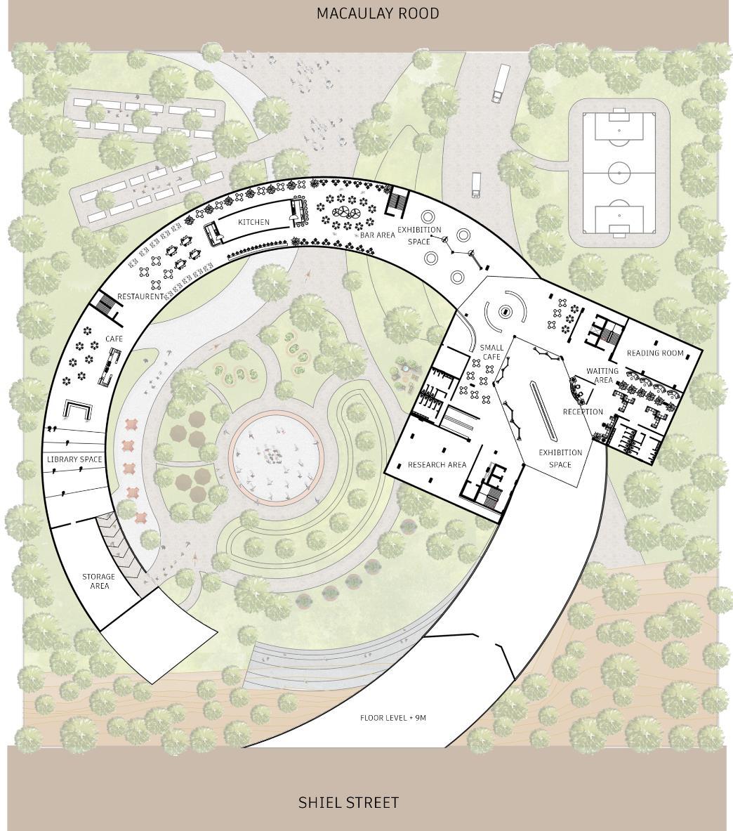 The zoning sketch plans establish a clear spatial hierarchy with easy movement across the site. Entry points from Shiel Street and Macaulay Road lead into the central cutout, forming the main circulation spine. Public spaces, such as the open theatre, market area, and exhibition pathways, activate the ground level. In contrast, semi-public zones, such as the café and leisure pockets, are positioned to support interaction and smooth transitions across the site.