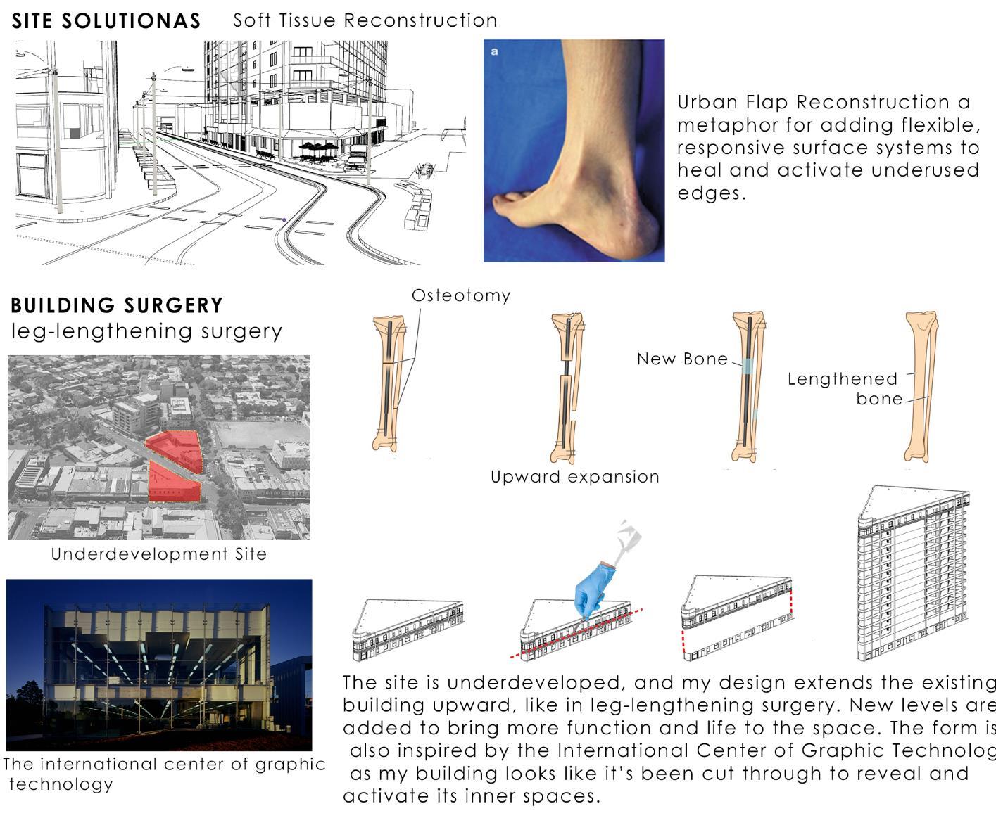 The site struggles with dead corners, heavy traffic edges, and unused narrow gaps. My design applies surgical metaphors, leg-lengthening, sinus-tract opening, and soft-tissue reconstruction to extend the building vertically, unlock hidden spaces, and activate inactive edges. These interventions introduce new circulation paths, upper-level access, and livable social layers, transforming the site into a connected and vibrant urban environment.