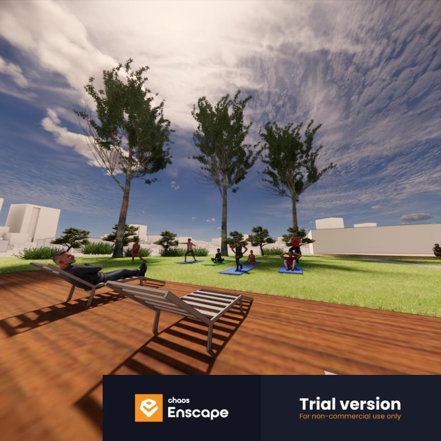 A cafe on one side offers a relaxed place for gatherings, while an Aqua Fitness Studio on the other promotes health and activity, supported by an adjacent waiting area. At the center, a Zen garden introduces calm and greenery, creating a quiet retreat within the building. Bike parking near the entrance supports sustainable mobility, and a discreetly placed waste collection zone ensures simple, efficient maintenance.