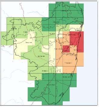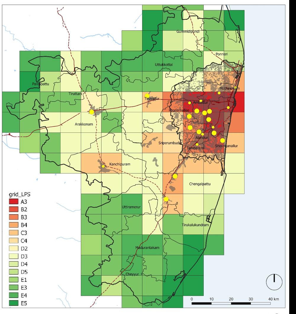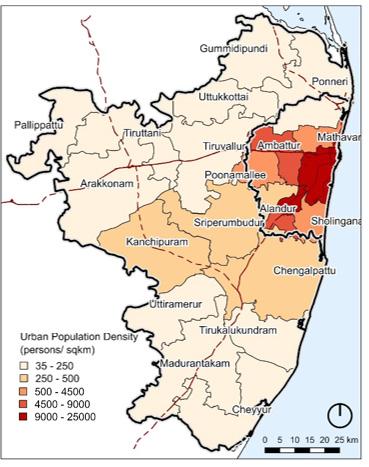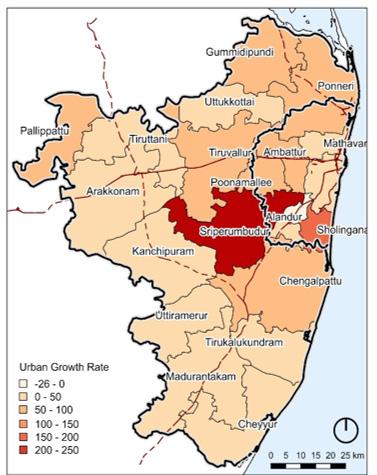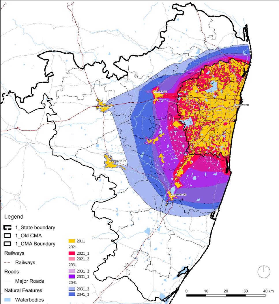 In Chennai (UA), between 2000-11, the population density declined annually at the rate of 1%. Therefore, there are two spatial growth projection scenarios 1 % annual decline in density (as per trends) and 2% annual decline in density (extreme case.)