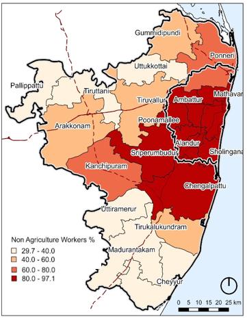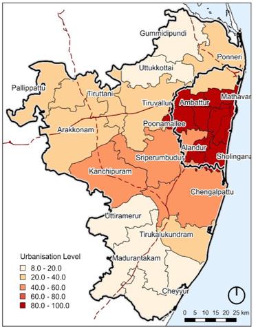 In January 2018, the government of Tamil Nadu brought out a notification announcing the expansion of Chennai Metropolitan Area to 8878 sq. km from 1189 sq. km. It comprises of districts of Chennai, Kancheepuram and Tirulvallur, Arakonam taluka from Vellore district and consists of 1 Municipal Corporation, 14 Municipalities, 20 Town Panchayats and 1888 Villages.