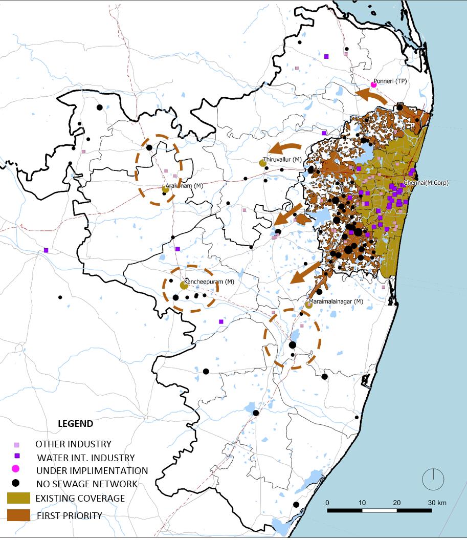 The priority area should be the Chennai agglomeration areas outside the district which don’t have sewerage network and other urban agglomerations near Industrial area. A Regional body is required which will expand the network as well as manage the recycled water, selling it to