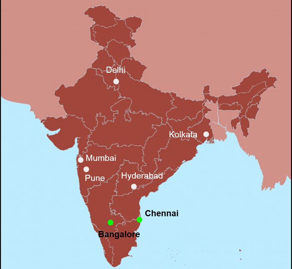 In India, there are 53 Urban Agglomerations that have a population over 10 lakhs of which the government has declared 7 as metropolitan areas: namely Mumbai, Delhi, Kolkata, Banglore, Hyderabad, Chennai and Pune.
