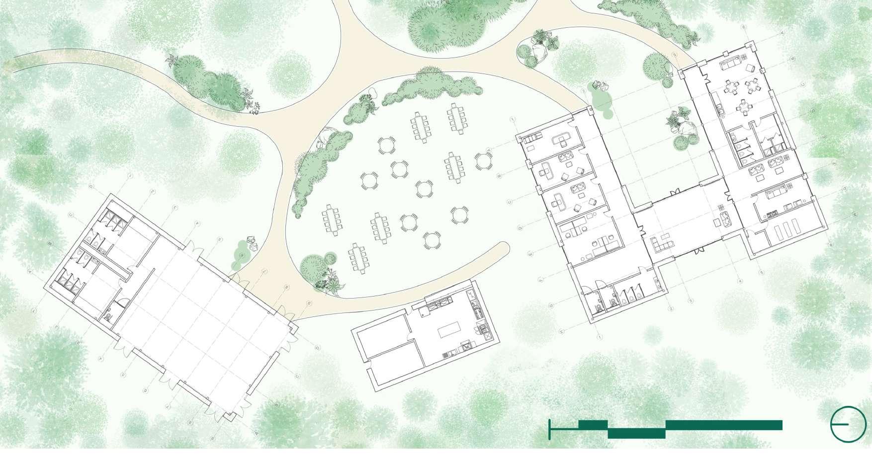 In this project I want my buildings to interact with nature in all its different forms. Whilst some classrooms make use of cleared grassland for assembly/ play, others have a relation to water/ forest which provides opportunities for students to have hands-on learning of their natural environment. I want the buildings themselves to be domestic in scale, and give the effect of several activity-specific cabins that are dispersed in the woods. This school includes a main Entrance/ admin block, main hall & servery, 2 clusters of classrooms for year 1 - 6 with each year group having 2 classrooms, and 4 specialist classrooms to the north of the site.