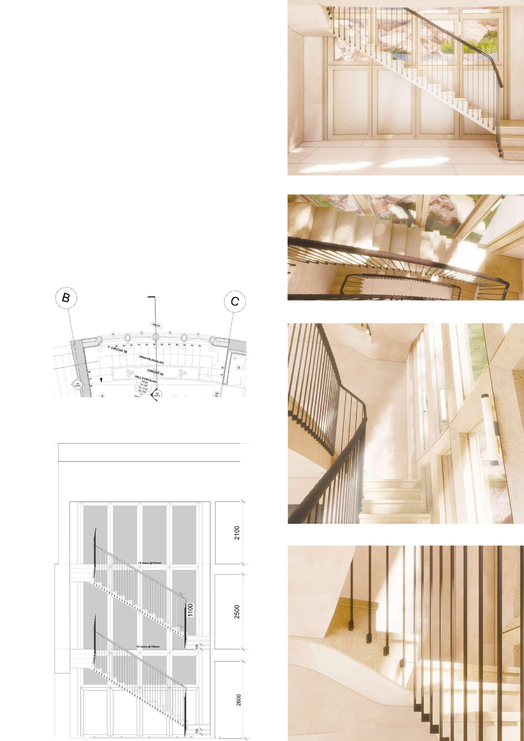My task for this villa in St Tropez was to come up with a couple of options for the main entrance staircase. After several iterations of the materiality, detailing of the steps and the shape of the balustrades, we settled on the version shown on the right. We decided to keep it simple yet elegant, using warm limestone finish for the stairs with a curved base detailing. Furthermore, wrapped leather was used on the handrails, which further complemented the rest of the color palette. All visuals and drawings shown were created by me for internal and client meetings.