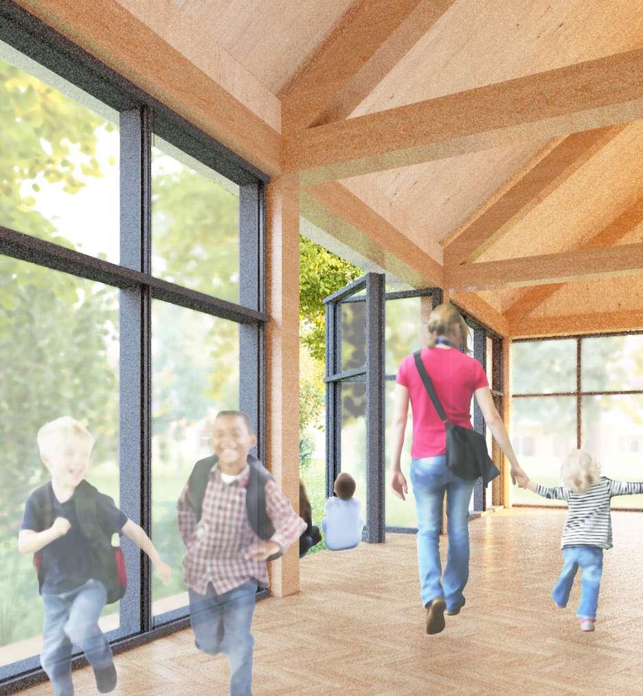 The Entrance block serves as the gateway to the school, establishing its overall tone on the western facade. The twin blocks, separated by the entrance lobby, visually represent the hidden structure. I aimed to expose this structure externally, enabling students to understand the support system of their classrooms. Bar-codes on the trusses allow students to scan and learn about the timber’s sourcing. Emphasizing practical learning, the queen truss is prominently featured on this facade.