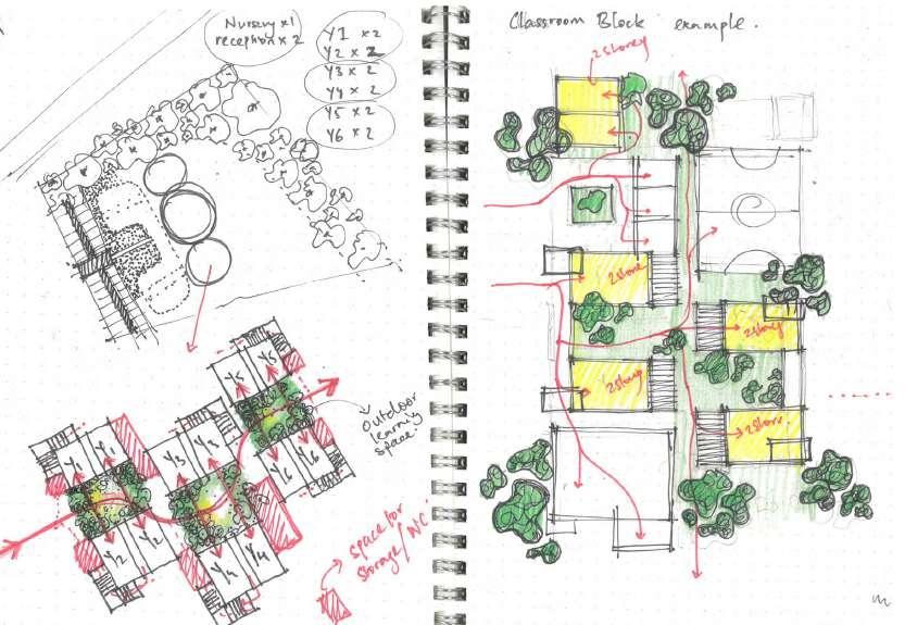 The first three blocks of this zone will house the key stage 1 students (year 1- 3). These classrooms were arranged in order to create their own cluster. I wanted the students of these classrooms to have their learning space be completely their own, surrounded by trees. And the clearings providing opportunities for student built tee-pees where they can continue their independent play/ learning