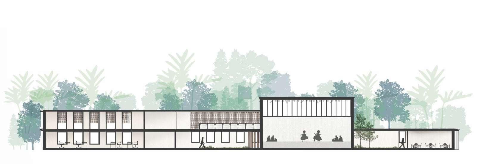 Zone 3 (Multi Purpose Hall & Admin block) Plan Admin Block Front Elevation (B) Western facade Admin Block Internal View (C) Zone 3 (Admin Block) A B 0m 2.5m 5m 10m 20m N 1 2 3 4 5 6 7 8 9 10 11 12 13 14 15 16 17 18
