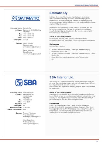SBA Interior Ltd. SBA Interior is a company founded in 1985 and employes today 80 persons. Our main industries are wall and ceiling panels and different type of pullman beds and sofa beds etc. Our expertise and experience of many years will grant our customers full satisfaction Company name SBA Interior Ltd. Address Hållsnäsintie 99 10360 Mustio FINLAND Tel. +3581932771 Web www.sba.fi Founded 1985 Employees 80 Annual turnover 12 M EUR Foreign subsidiaries none Contact Thomas Pökelmann Project Manager thomas.pokelmann@sba.fi
