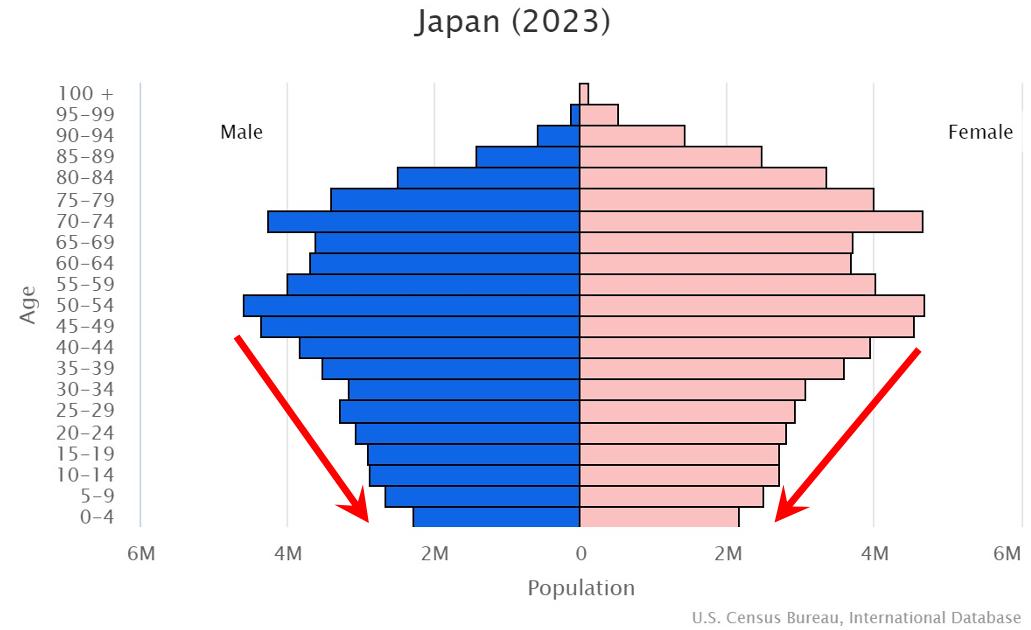 Figure 2: Population pyramid for Japan in 2023 (U.S. Census Bureau)