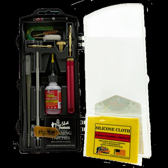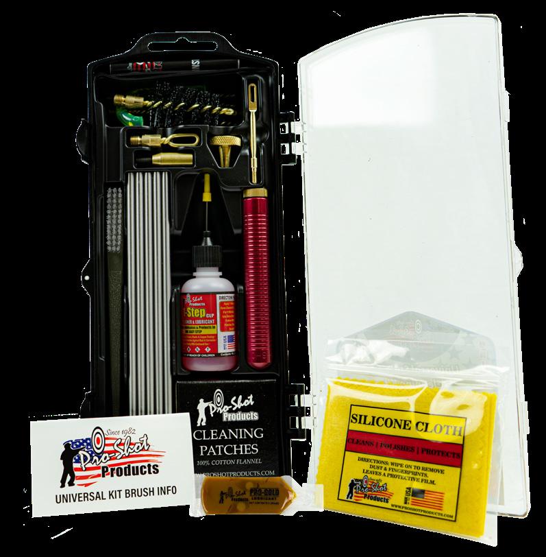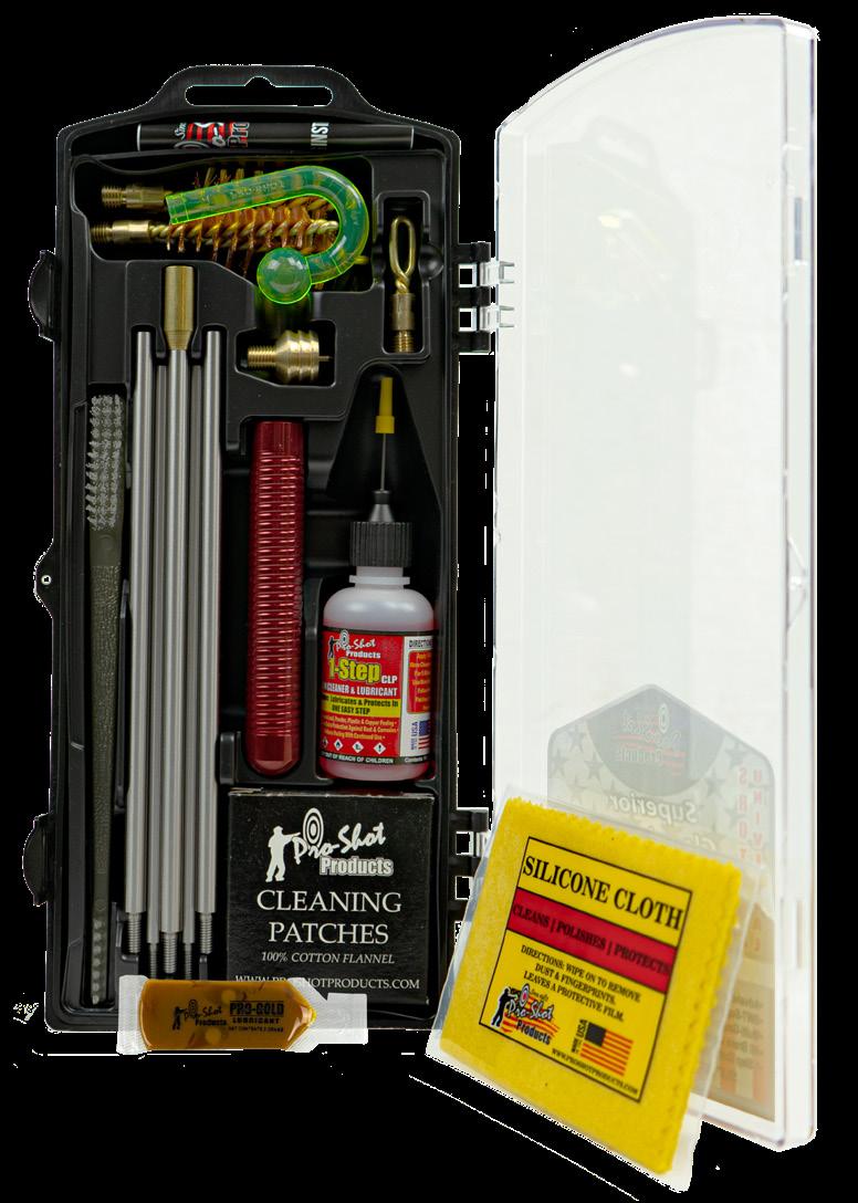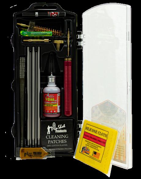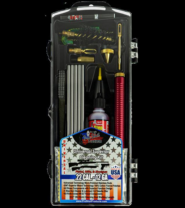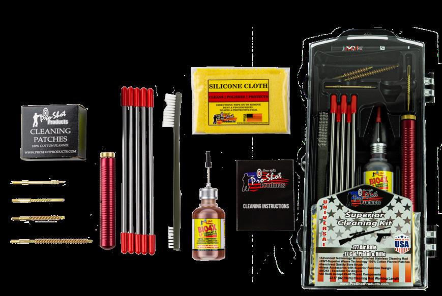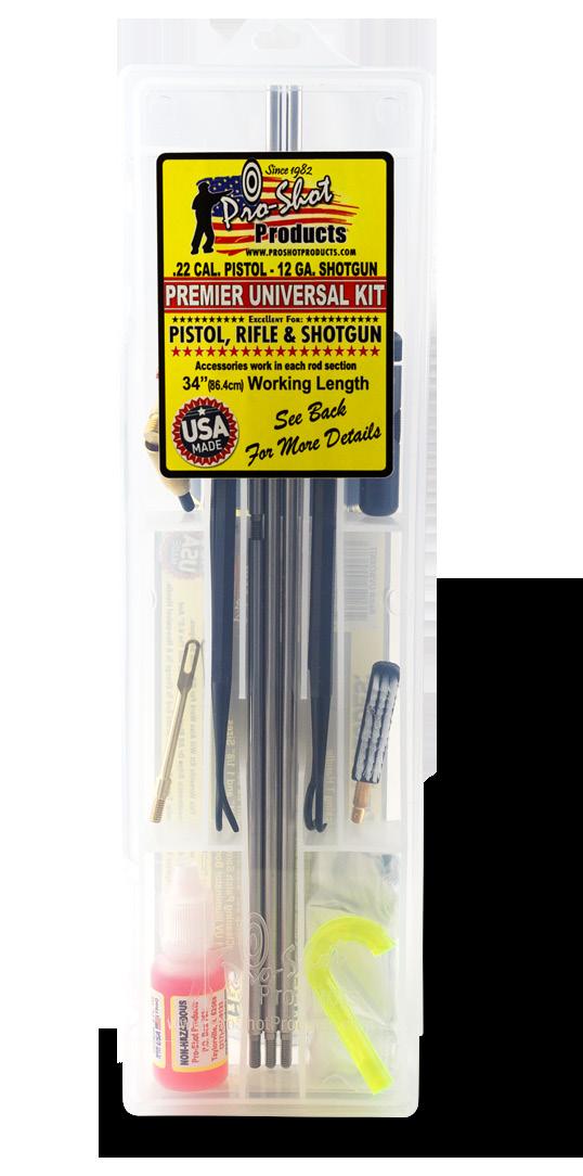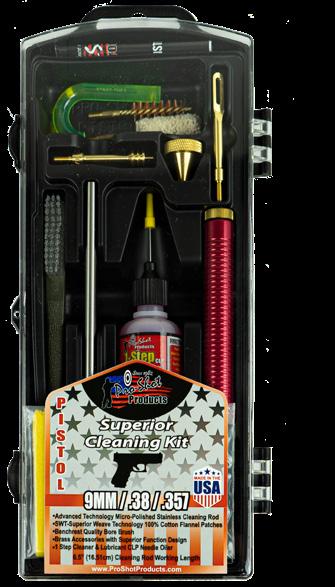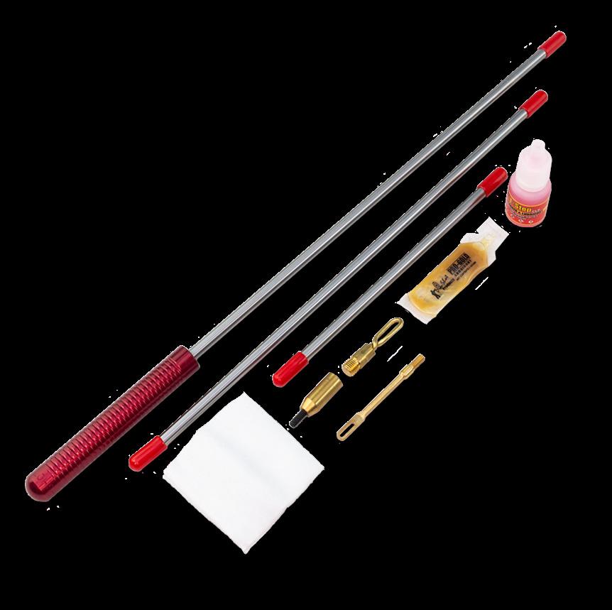 Includes 3 Piece 36” Working Length Stainless Micro-Polished Rod Sections with Swivel handle, Bore Cleaner, 1 Step CLP Bore Brush, Bore Mop, Button Style Jag, and Cleaning patches