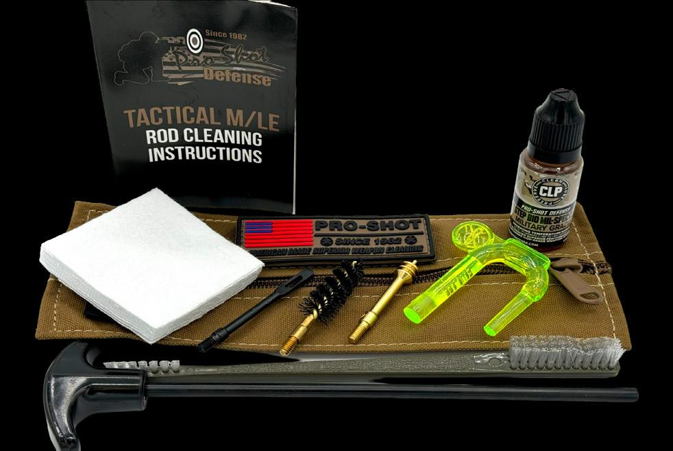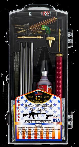 ITEM# COY-AR223 AR15/.223/5.56MM KIT INCLUDES: Coyote Tactical Pouch, 5 Coyote Coated Rod Sections with a Combined Working Length of 32.5”, Swivel Aluminum T-Handle with Chamber Lock End, Double End Nylon Utility Brush, Bore Brush, Brass Spear Tip Jag, Patch Holder, Chamber Brush, Chamber Mop, 1-Step Needle Oiler, Cleaning Patches, Pro-Gold Lubricant, Silicone Cloth, UV Illuminator Chamber Flag Bore Light.