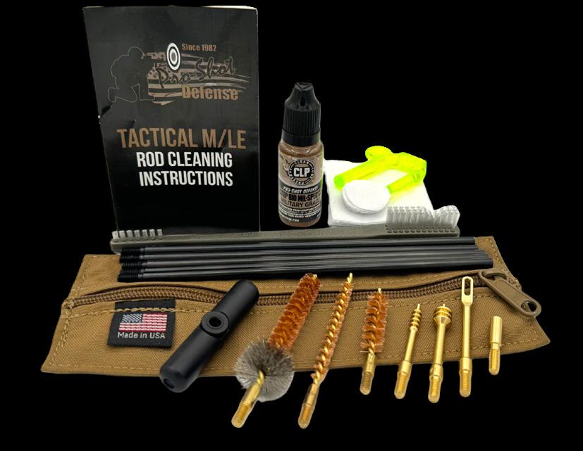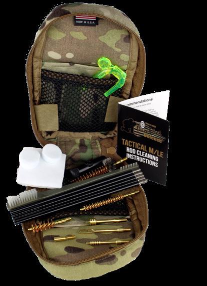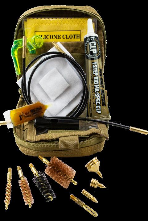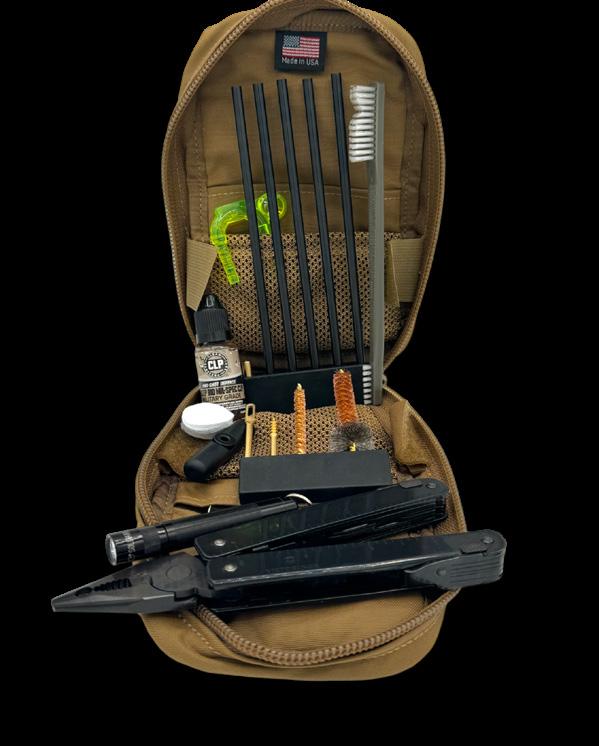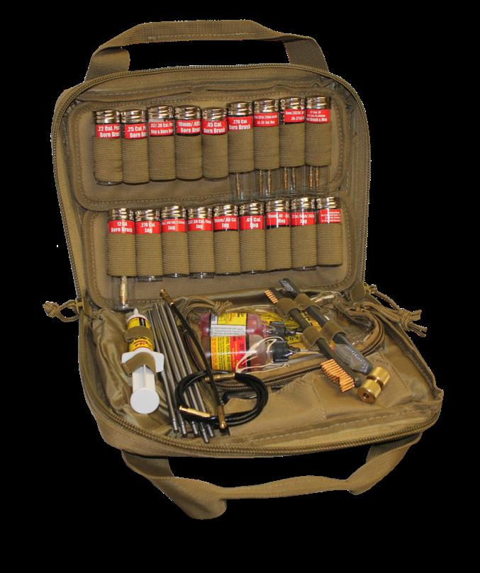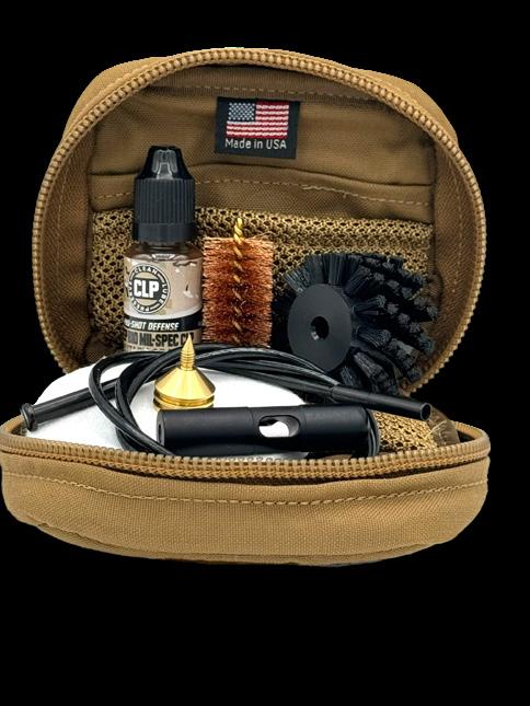 ITEM# COY-30 AR10/.30 CAL./.308 CAL./7.62MM KIT INCLUDES: Coyote Tactical Pouch, 5 Coyote Coated Rod Sections with a Combined Working Length of 32.5”, Swivel Aluminum T-Handle with Chamber Lock End, Double End Nylon Utility Brush, Bore Brush, Brass Spear Tip Jag, Patch Holder, Chamber Brush, Chamber Mop, 1-Step Needle Oiler, Cleaning Patches, Pro-Gold Lubricant, Silicone Cloth, UV Illuminator Chamber Flag Bore Light.
