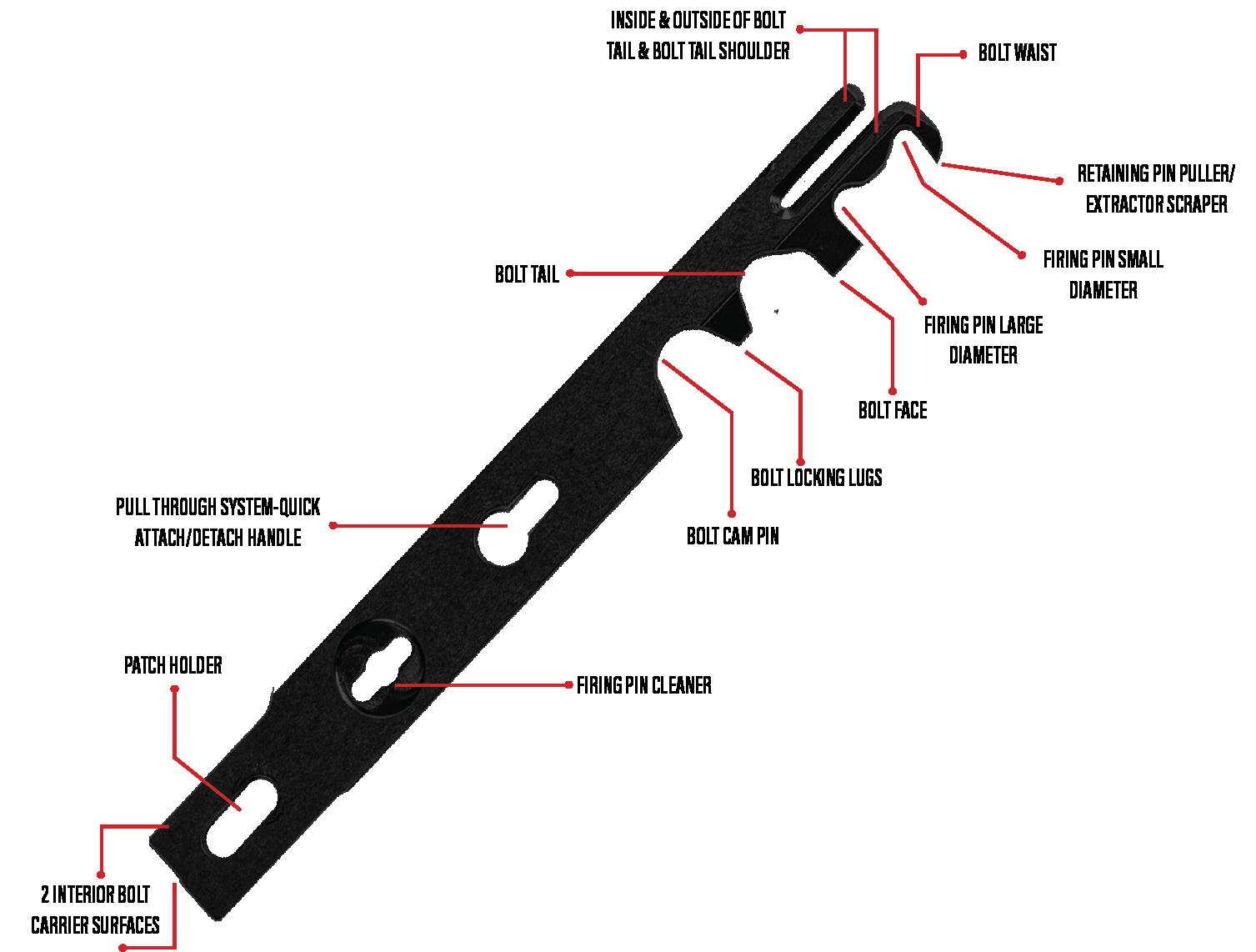The Pro-Shot BCG Tool cleans 12 critical bolt carrier group surfaces, made from 304 Stainless Steel with Black Nitride Coating. Specifically designed for using a cleaning patch with CLP on two critical areas to reduce cleaning time. Use a patch with the tool on the outside of the bolt tail & waste and with the bolt locking lugs. Includes quick attach/detach handle function in middle of tool for tactical pull through system. Excellent for your workbench, cleaning kit, or range bag.