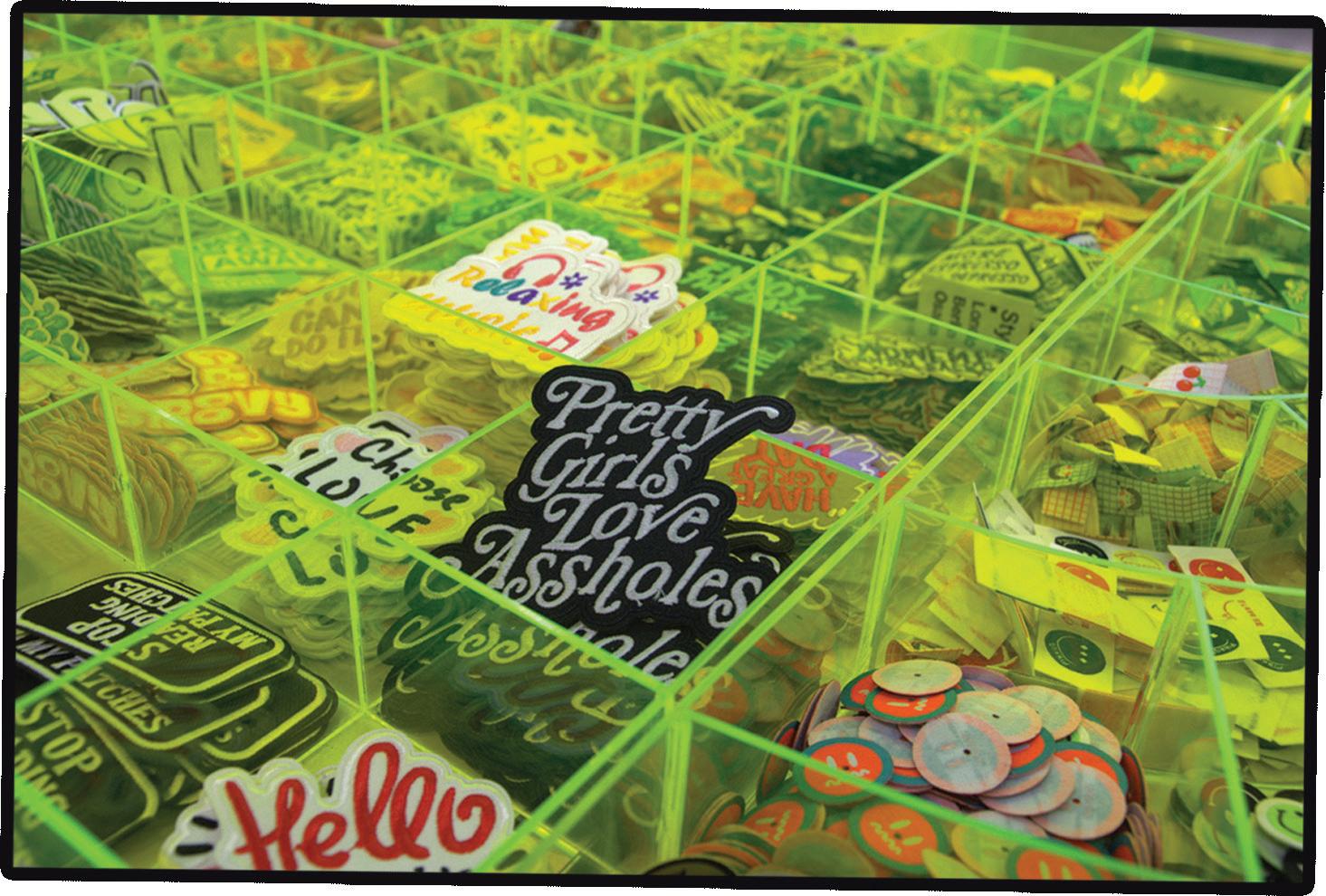 From industrial sewing machines, embroidery, thermal transferring, digital printing, and vinyl cutting, they take customization seriously. Against one wall, a wide array of patches is displayed, catering to many different styles and aesthetics. The patches come in a variety of colors and sizes and are available as sew-on patches, iron-on transfers, or enamel pins, giving customers options for self application if they wish. In the center of the store, three stands hold patches for easier access, ensuring customers have plenty of choices.