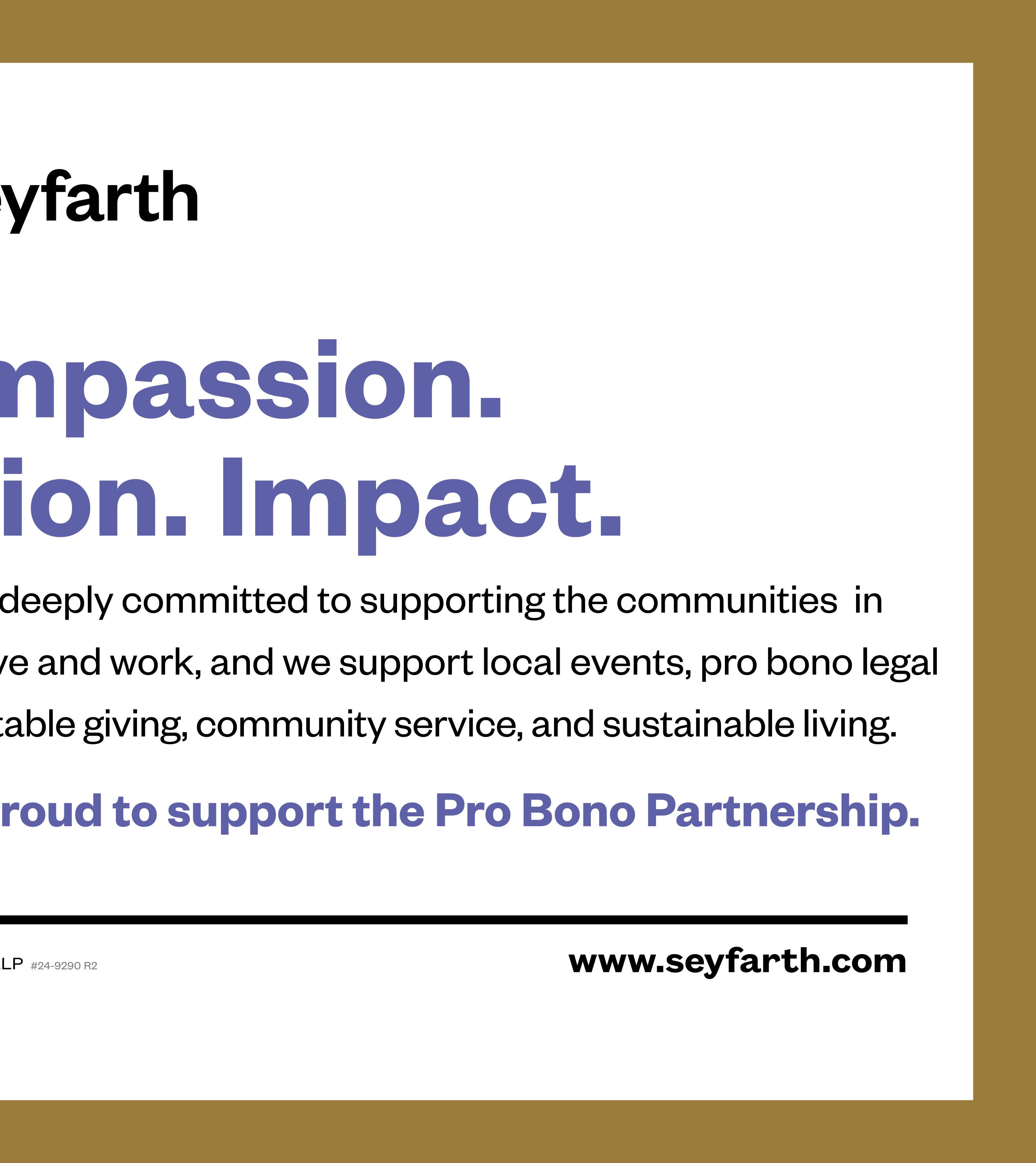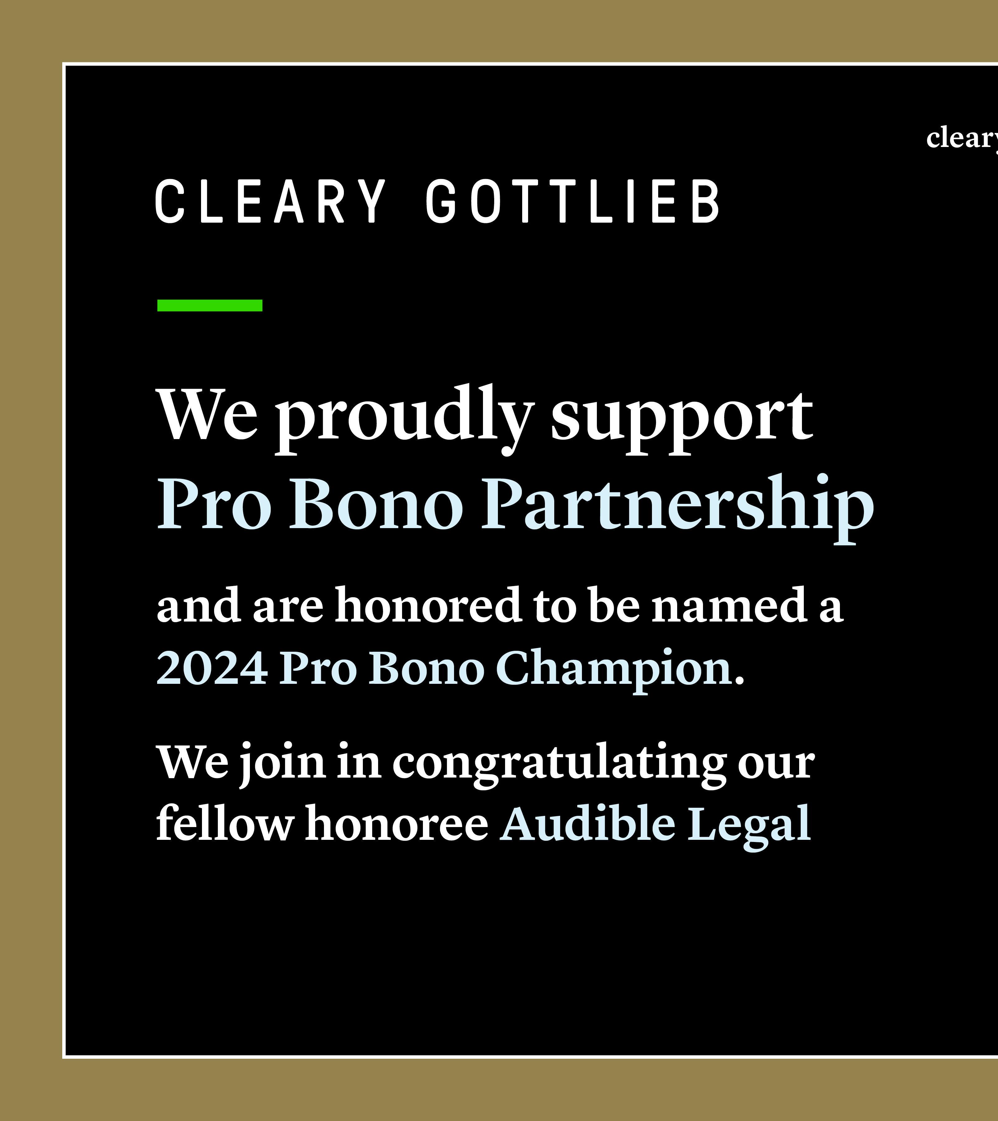 2024 Pro Bono Champions, Audible Legal and Cleary Gottlieb. As longtime supporters, these Champions demonstrate their commitment to pro bono work every day. You’ll learn more about their contributions tonight, and how they have truly advanced the legal profession while helping the Partnership empower nonpro ts and