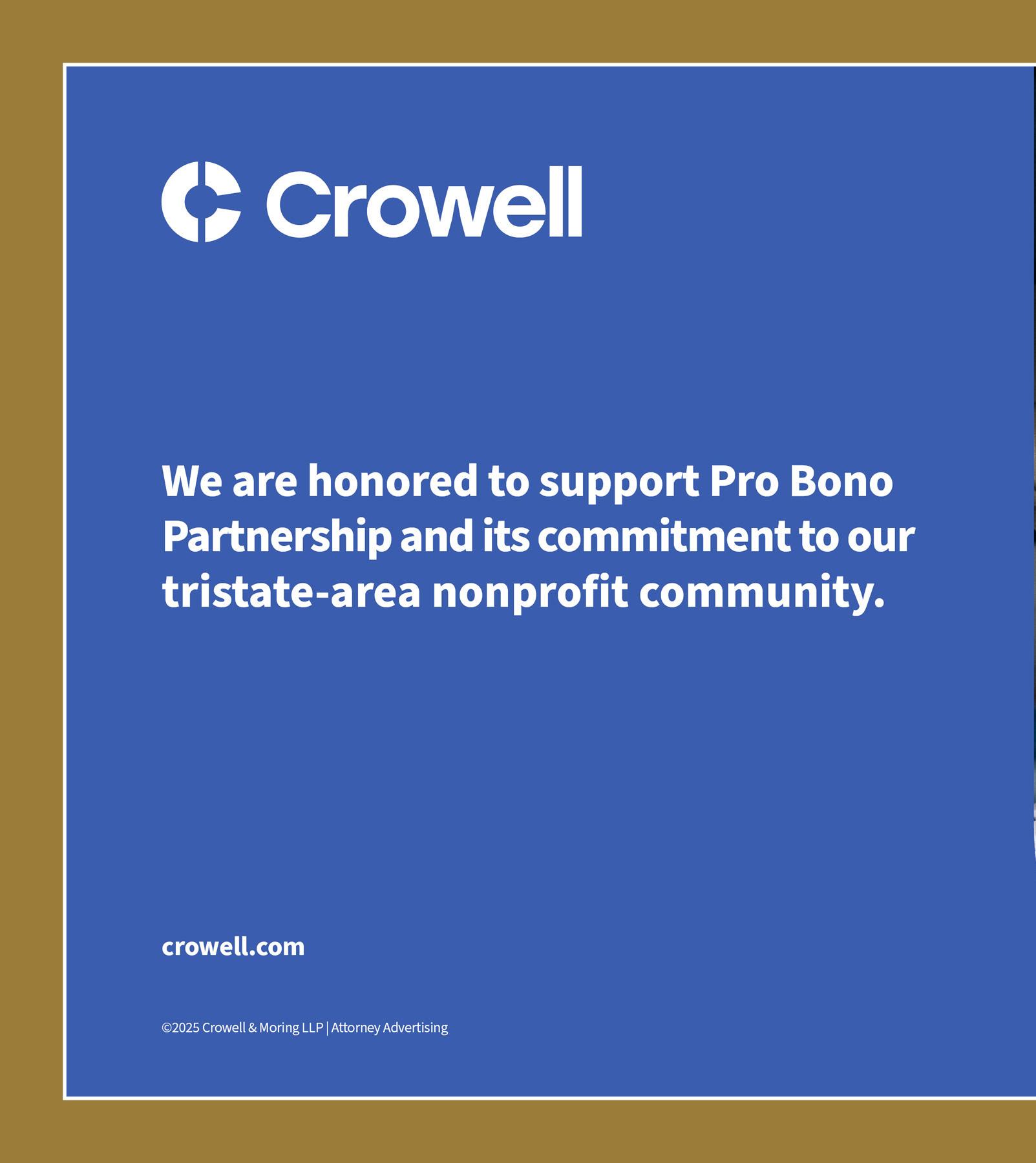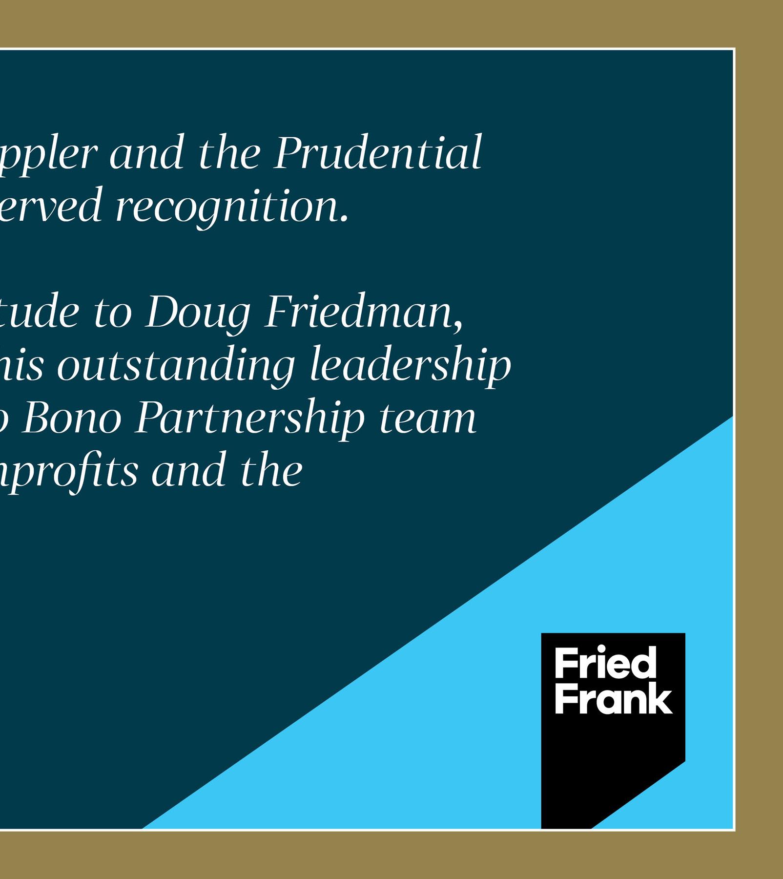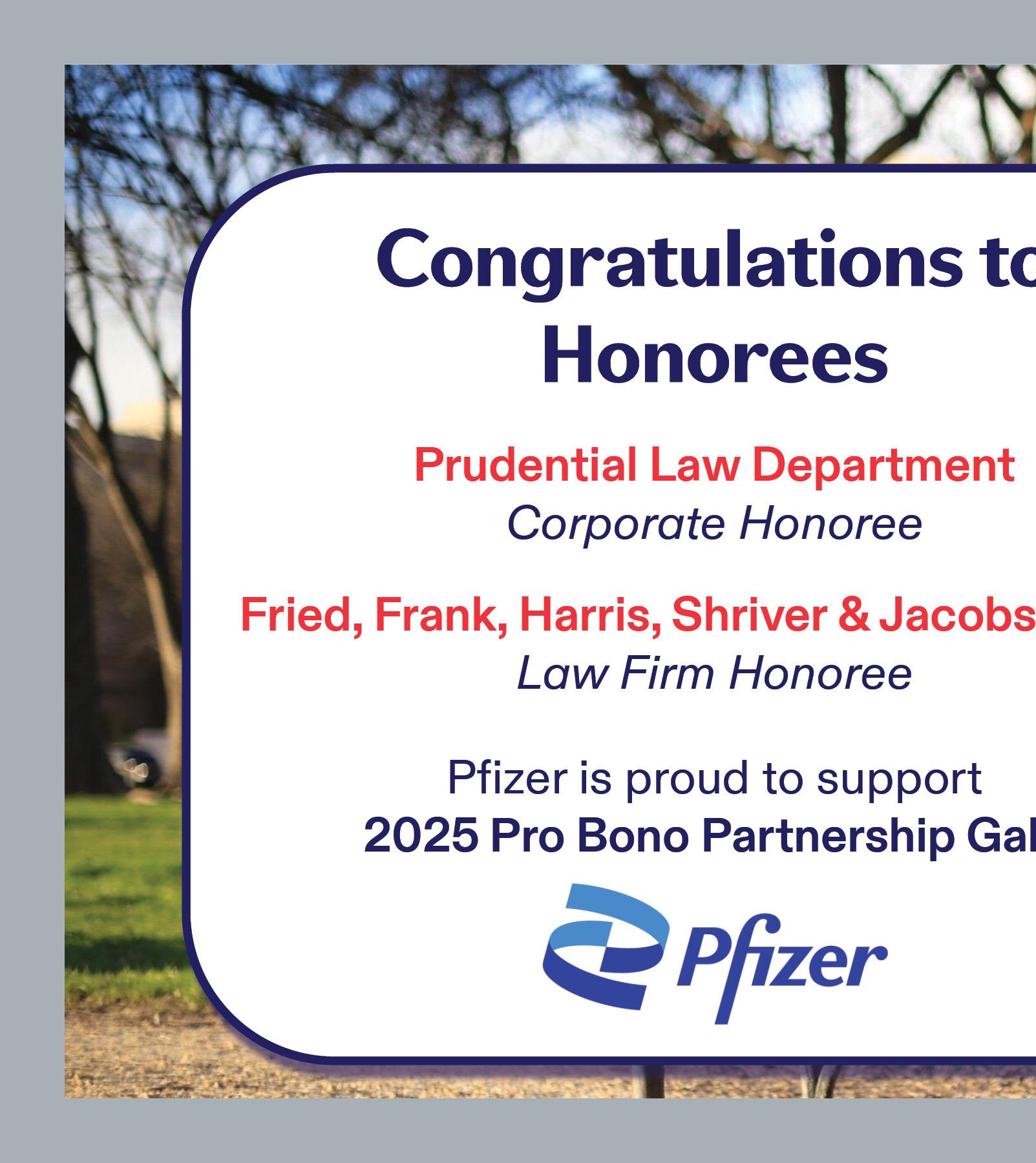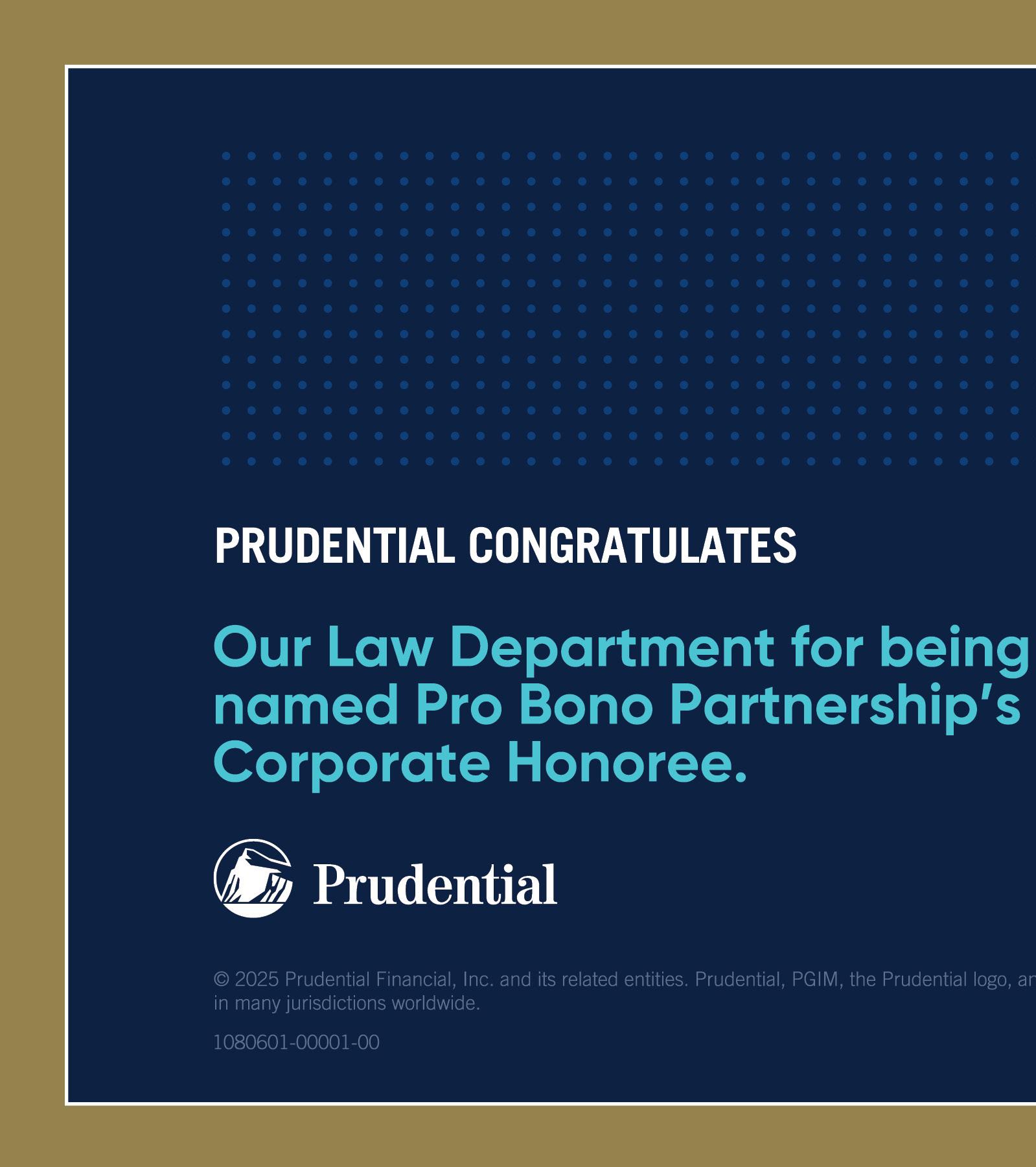 At the heart of this effort are our 2025 Pro Bono Champions, Fried Frank and the Prudential Law Department. These longtime supporters are deeply committed to pro bono work, and to advancing the Partnership’s mission. They set a powerful example for what can be accomplished when we work together in service of others.