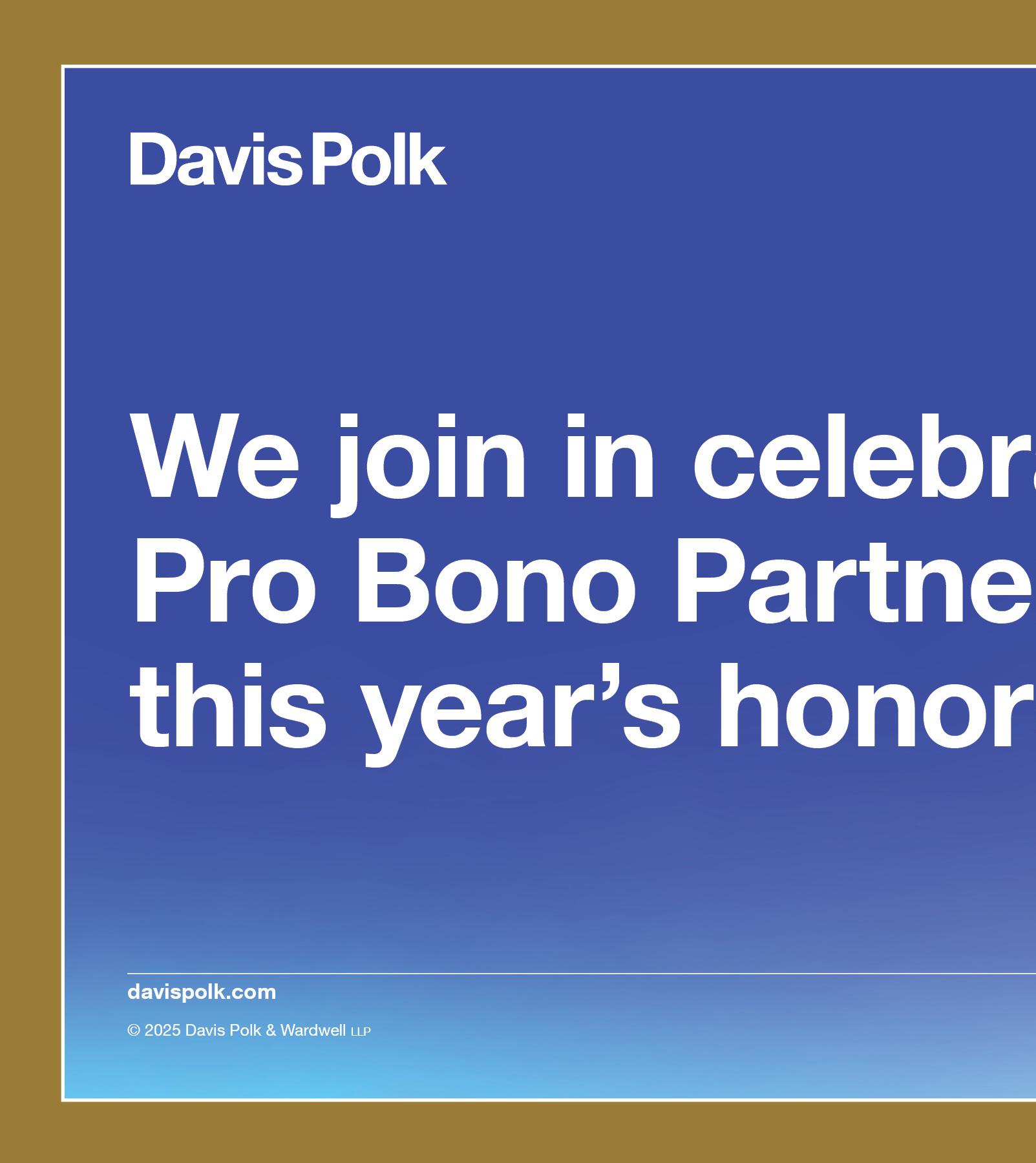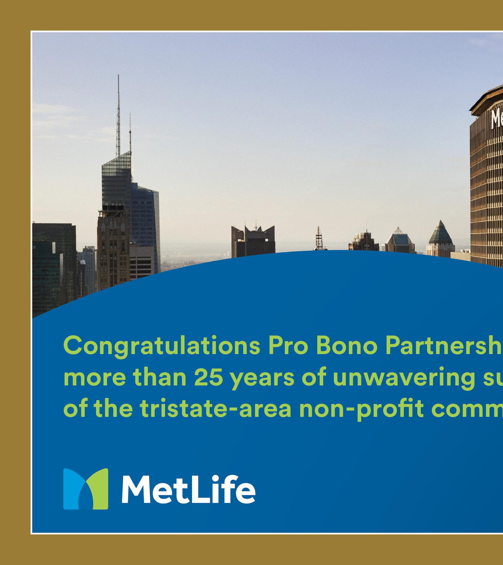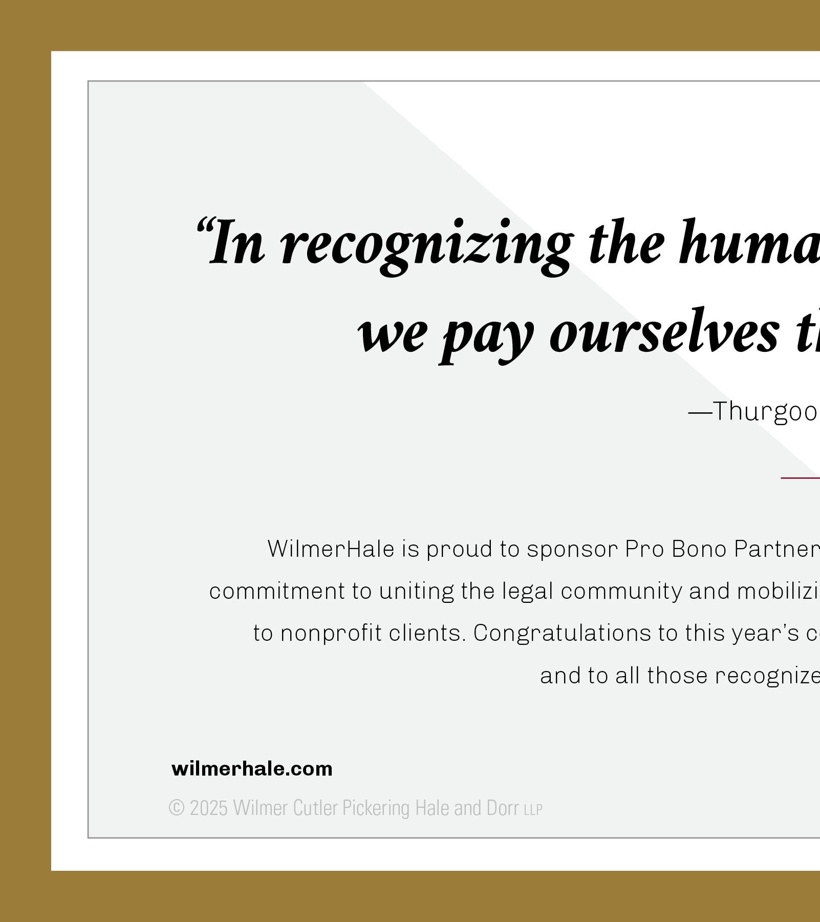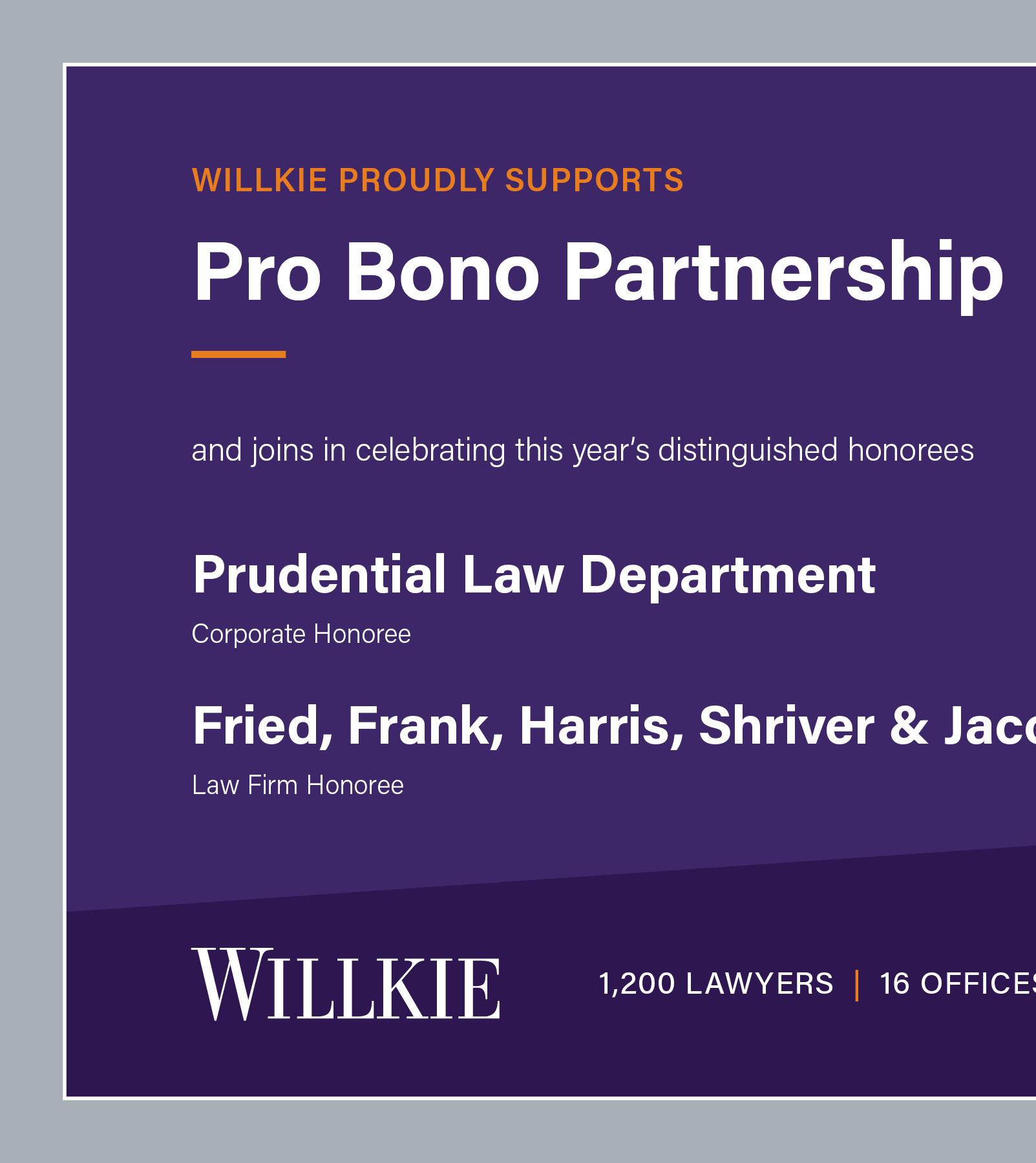 At the heart of this effort are our 2025 Pro Bono Champions, Fried Frank and the Prudential Law Department. These longtime supporters are deeply committed to pro bono work, and to advancing the Partnership’s mission. They set a powerful example for what can be accomplished when we work together in service of others.