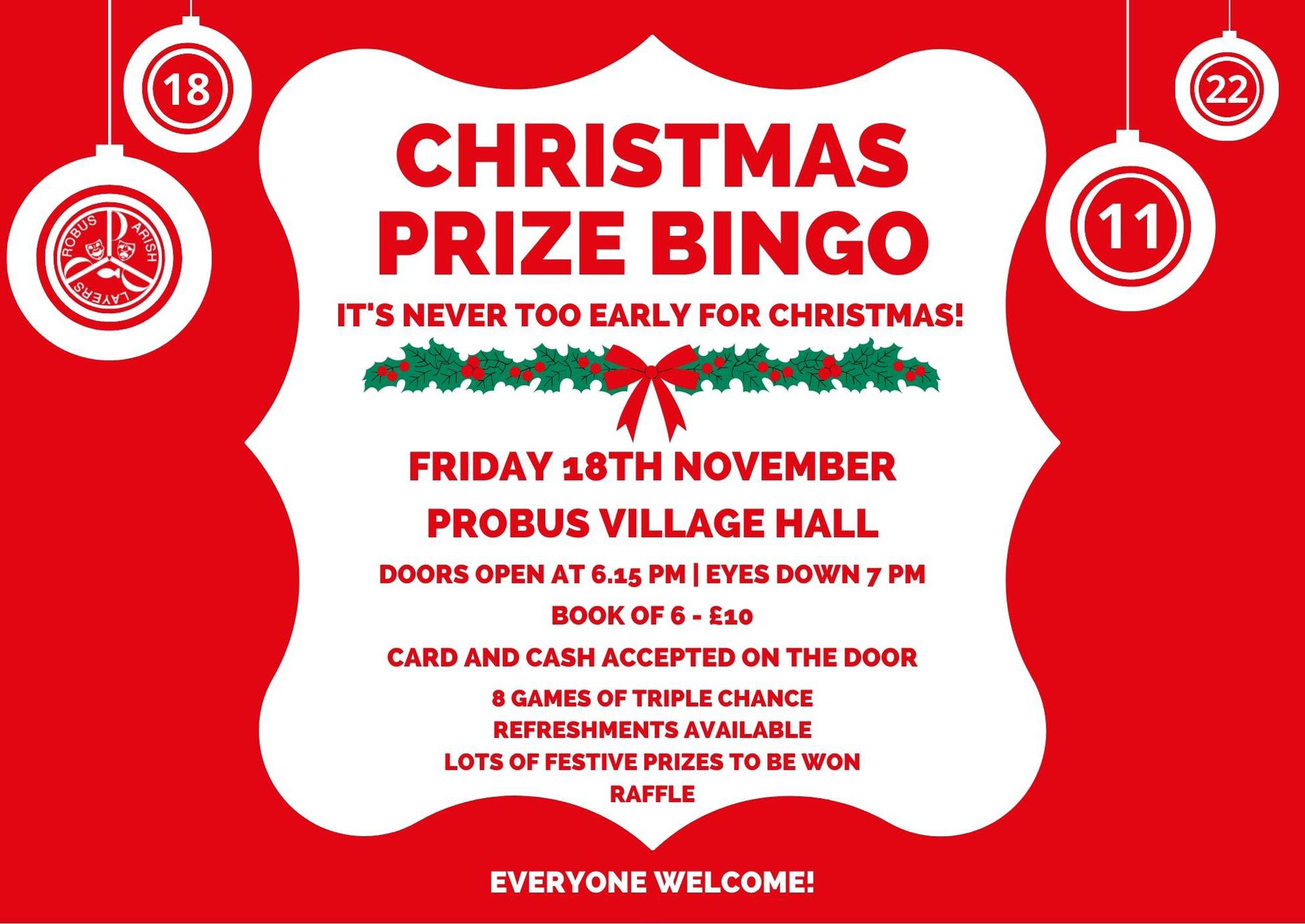 Probus Church Christmas Fayre: Saturday 26th November between 2 pm and 4 pm. As usual, Dave Meggs will be collecting bottles for the bottle stall from the beginning of November