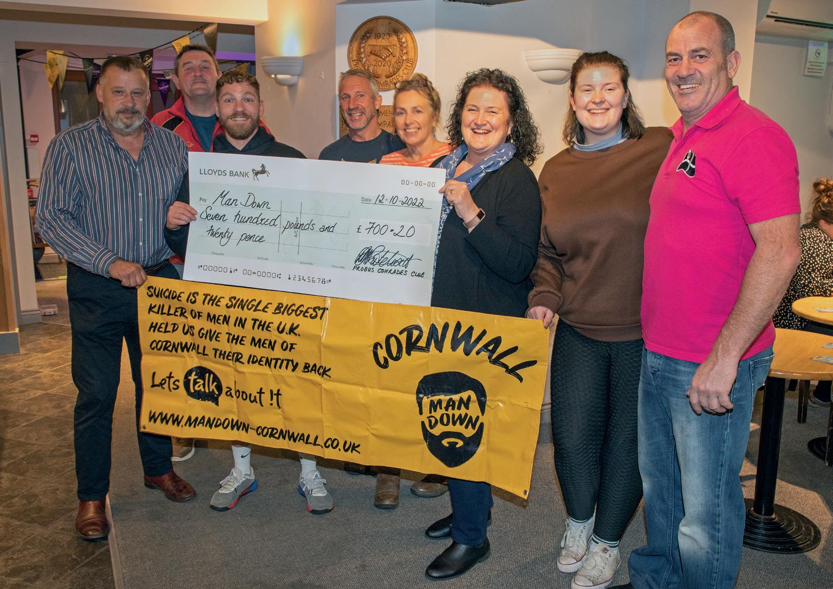 DURINGthe Ale Festival earlier this year, Probus Comrade Club raised £700 for Man Down Cornwall, the men’s mental health charity. The fundraising was achieved in several ways over the Ale Festival weekend that also included a talk from Ross Withers on the Ben Nevis challenge, covered in last month’s magazine.