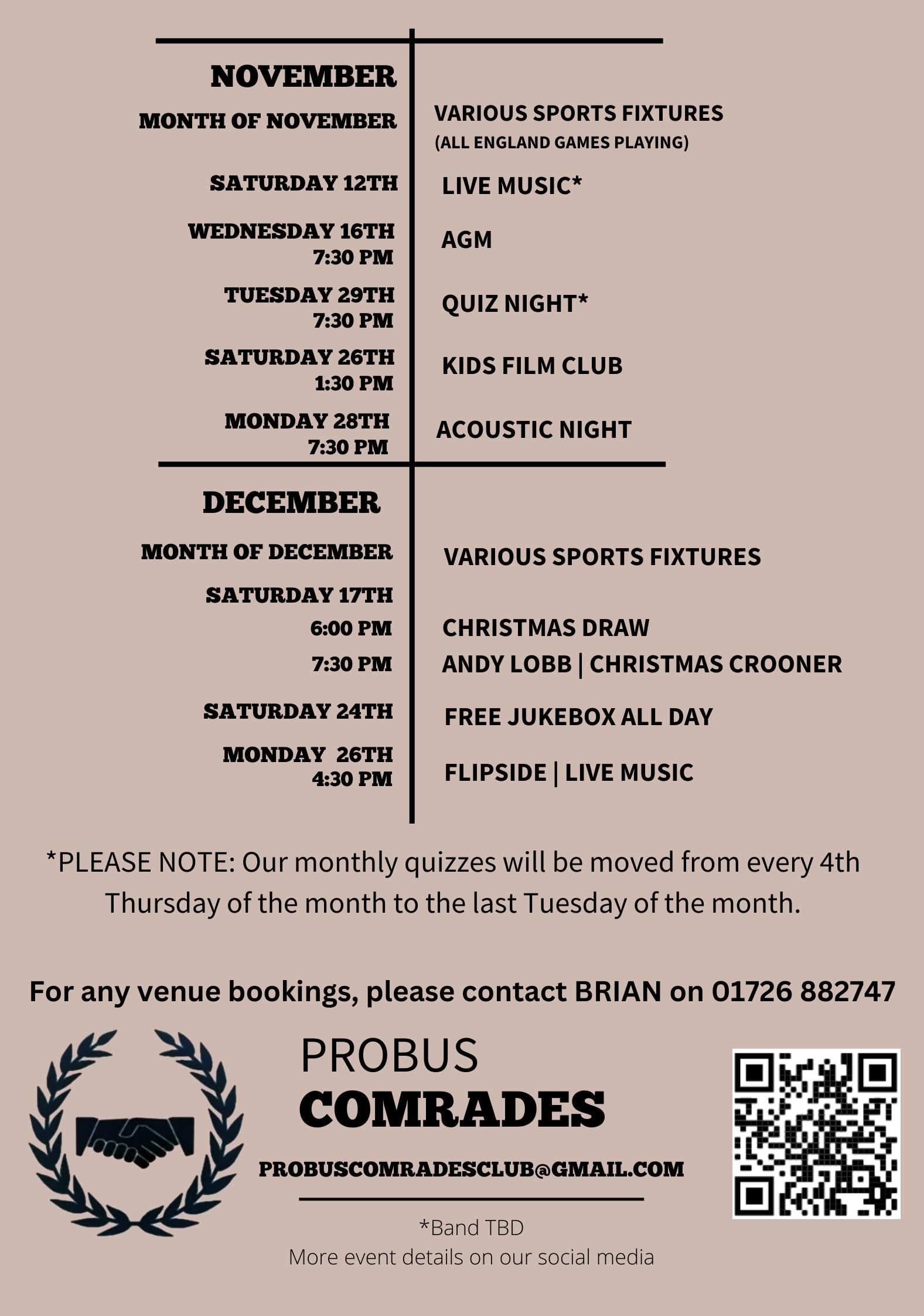 Key: PVH = Probus Village Hall. PCC = Probus Comrades Club.