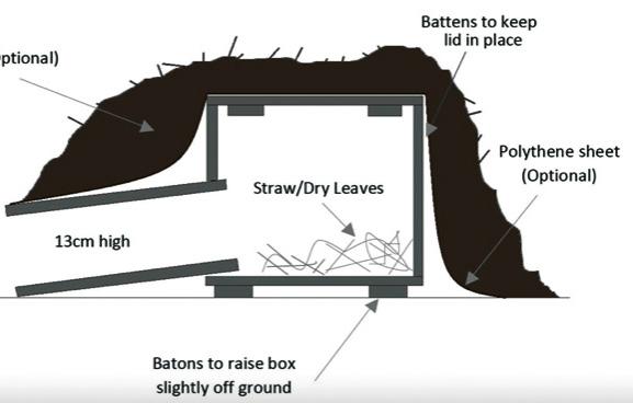 available, including wooden boxes (below) and rattan igloo shelters, which you can either purchase complete or else build your own. In terms of location, Prickles and Paws Hedgehog Rescue (in Cubert) recommend a shady, quiet and sheltered area, ideally amongst lots of undergrowth. As nest builders, hedgehogs will make use of the natural nesting materials they come across. You can help them settle in by placing a handful of hay or dried leaves in the hedgehog house.